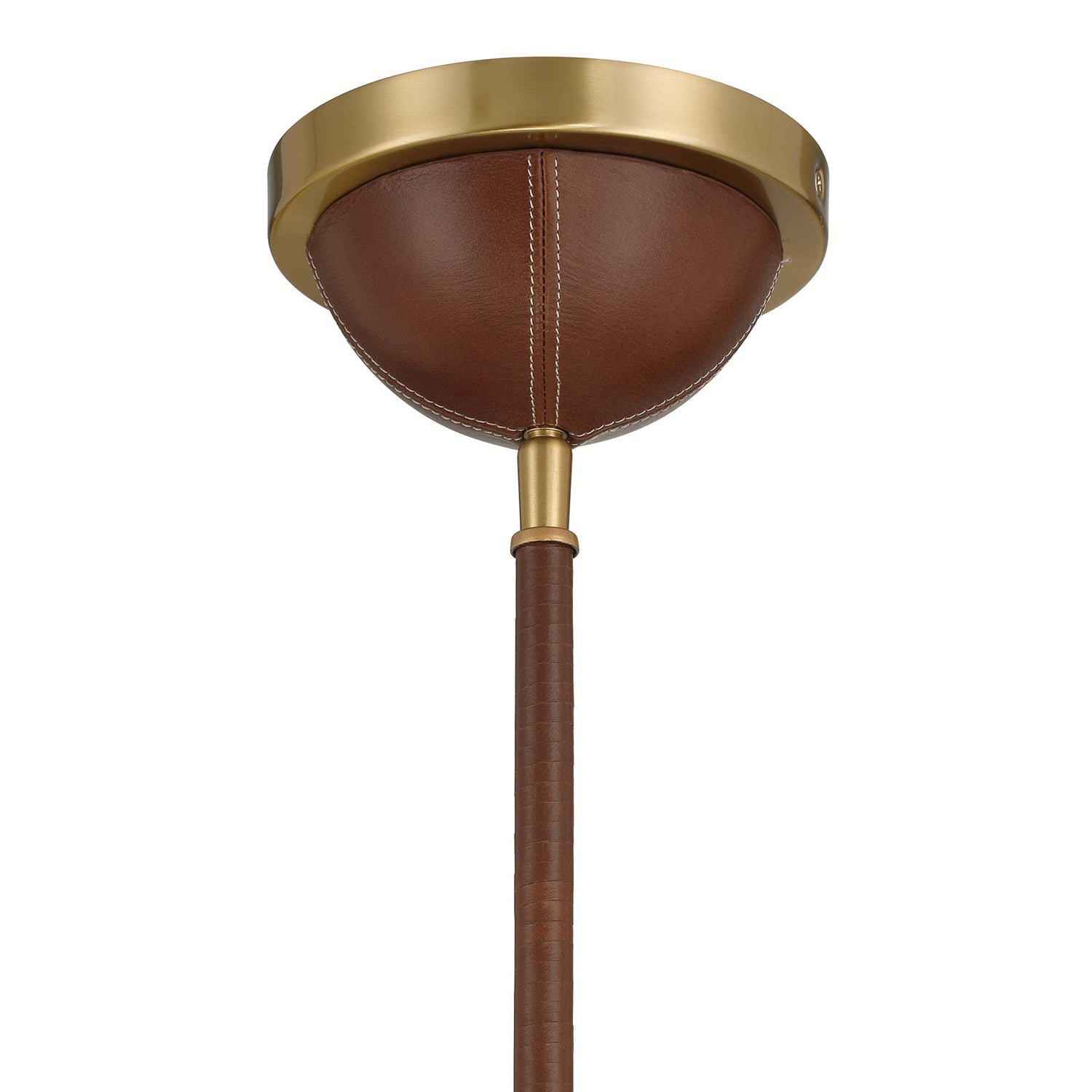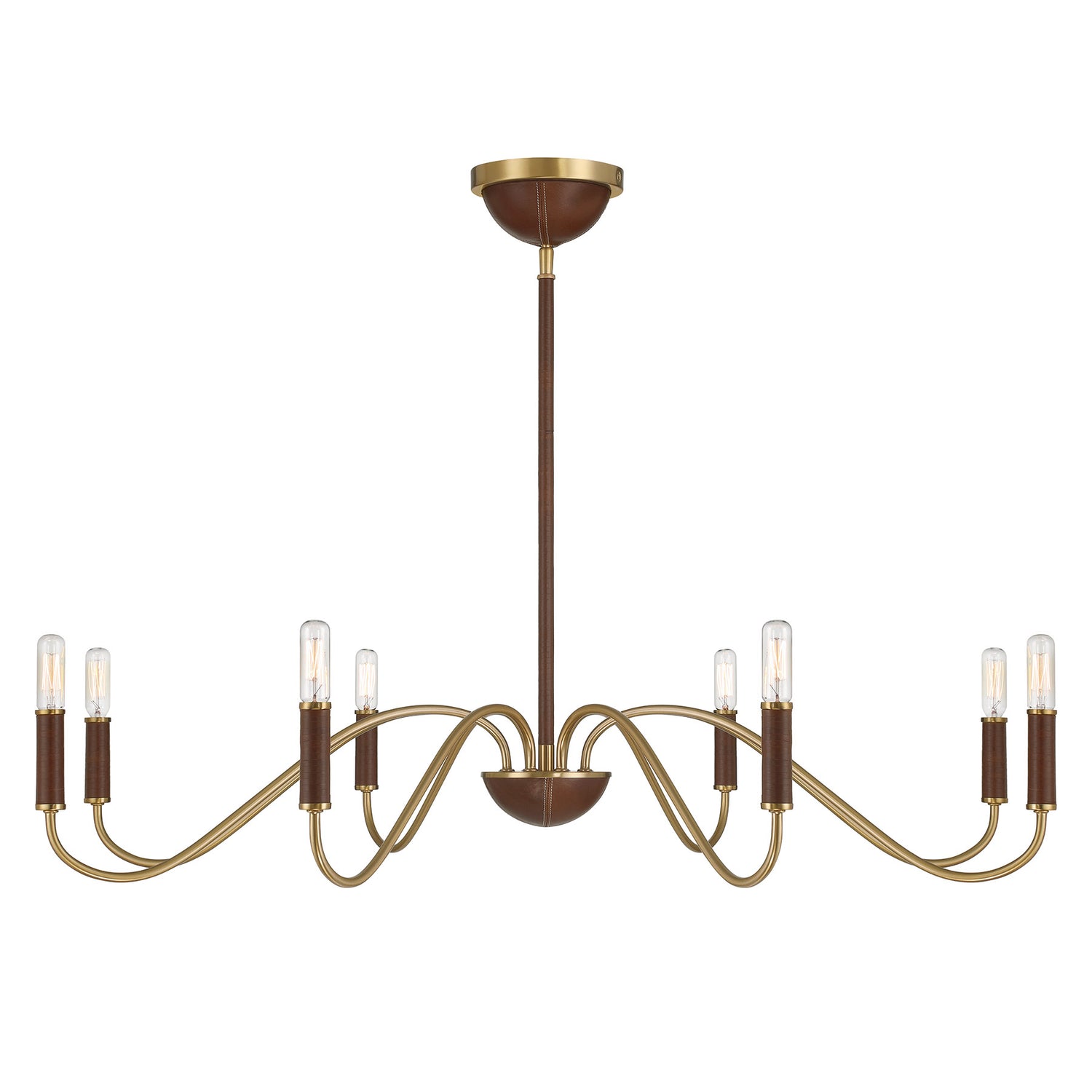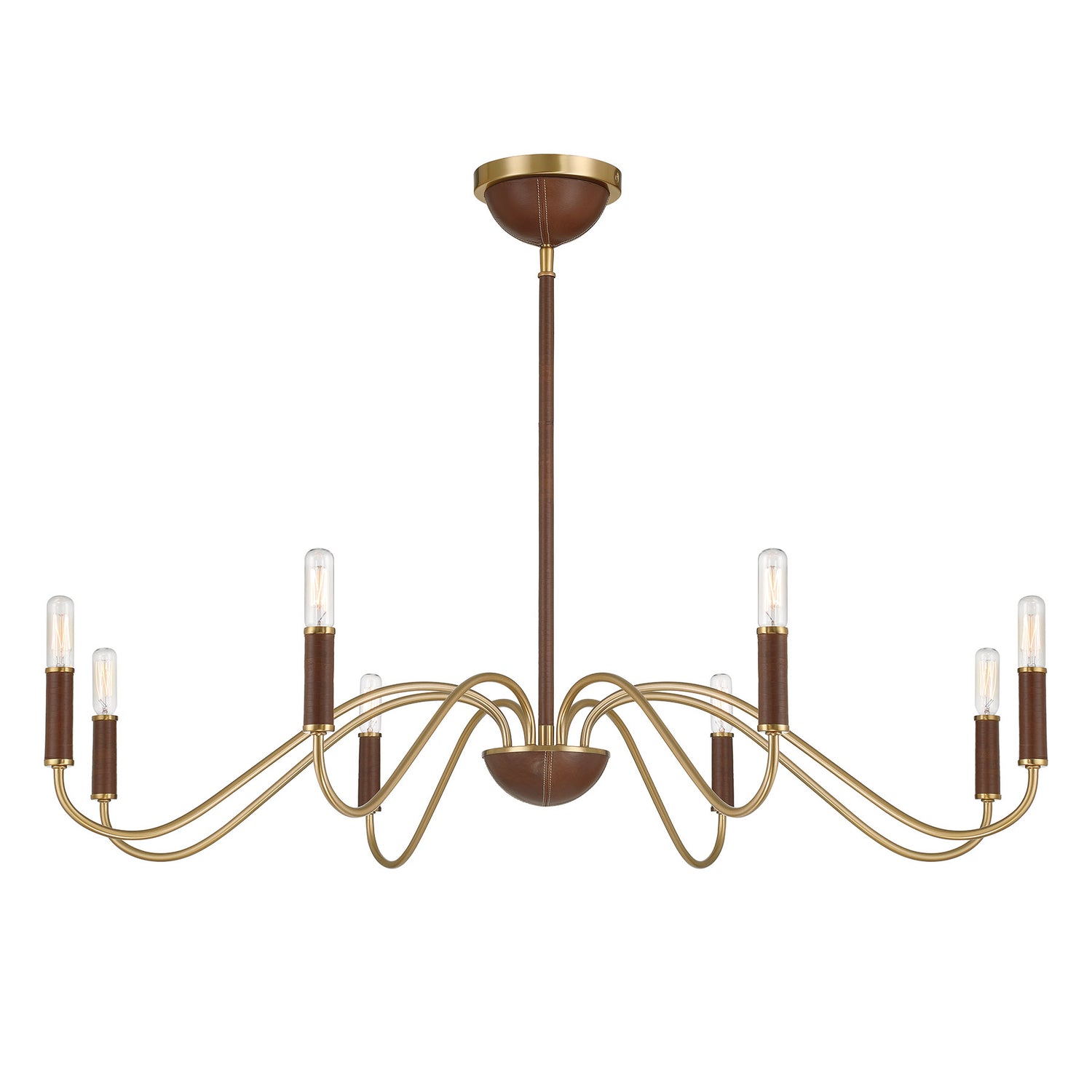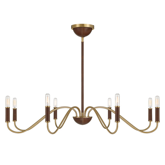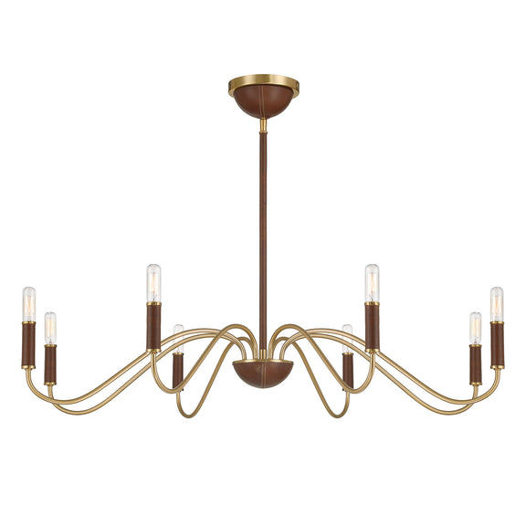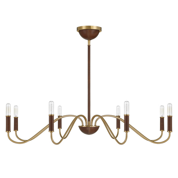 Discover the stately stylings of the Savoy House Abeline 8-light chandelier, which is decorated with natural leather to add richness and texture. You can even see evidence of the careful craftsmanship through detailed stitching on the ceiling canopy and finial! The Warm Brass finish pairs up perfectly with the chestnut tone of the leather. Abeline is 39" in width and has an adjustable height ranging from 6" to 64". Uses eight candelabra size bulbs of up to 60 watts per bulb. Bulbs not included. Comes with four 12" downrods and one 6" downrod.