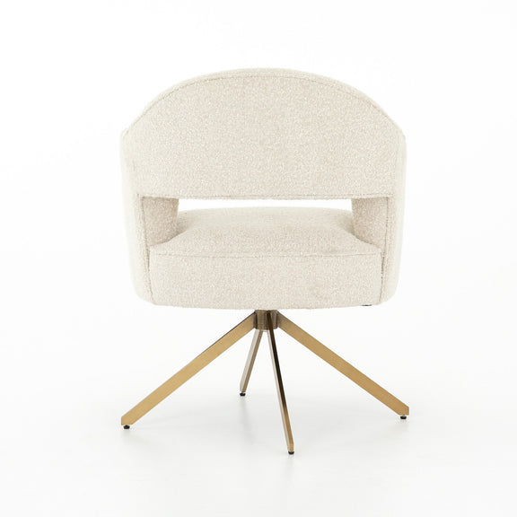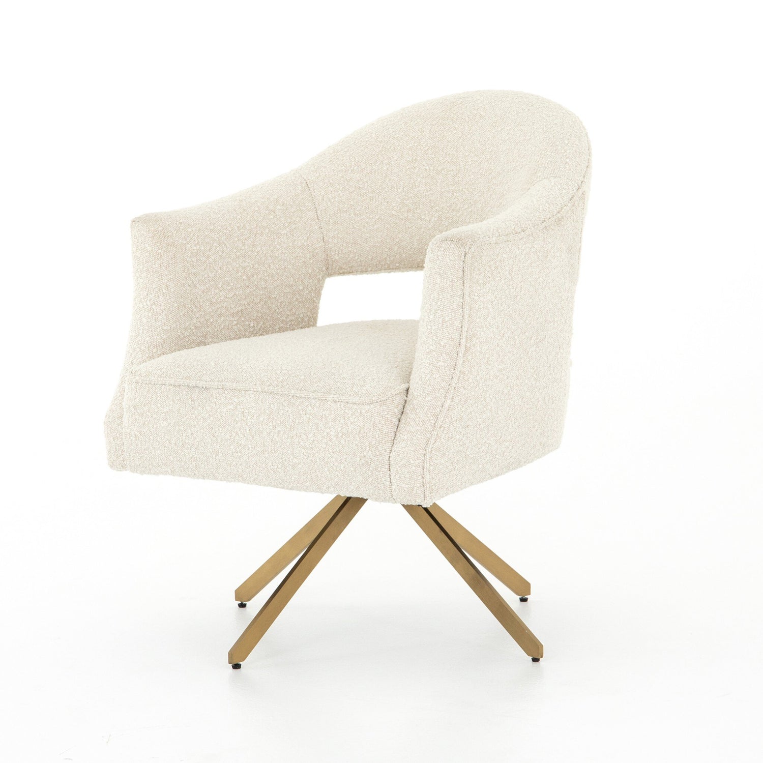 A Seventies form gets a modern refresh. Velvety olive upholstery shapes comfortable curves, lightened up with a posterior cutout. Polished brass legs taper at a slant for retro effect. A 360-degree swivel base brings ease to the modern office.