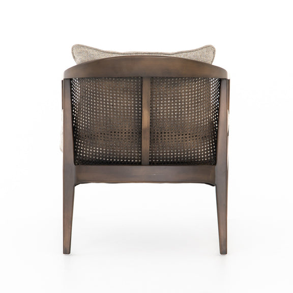 Mid-century modern inspiration with a French twist. Sleek, hand-shaped birch framing is accented by textural woven rattan back.