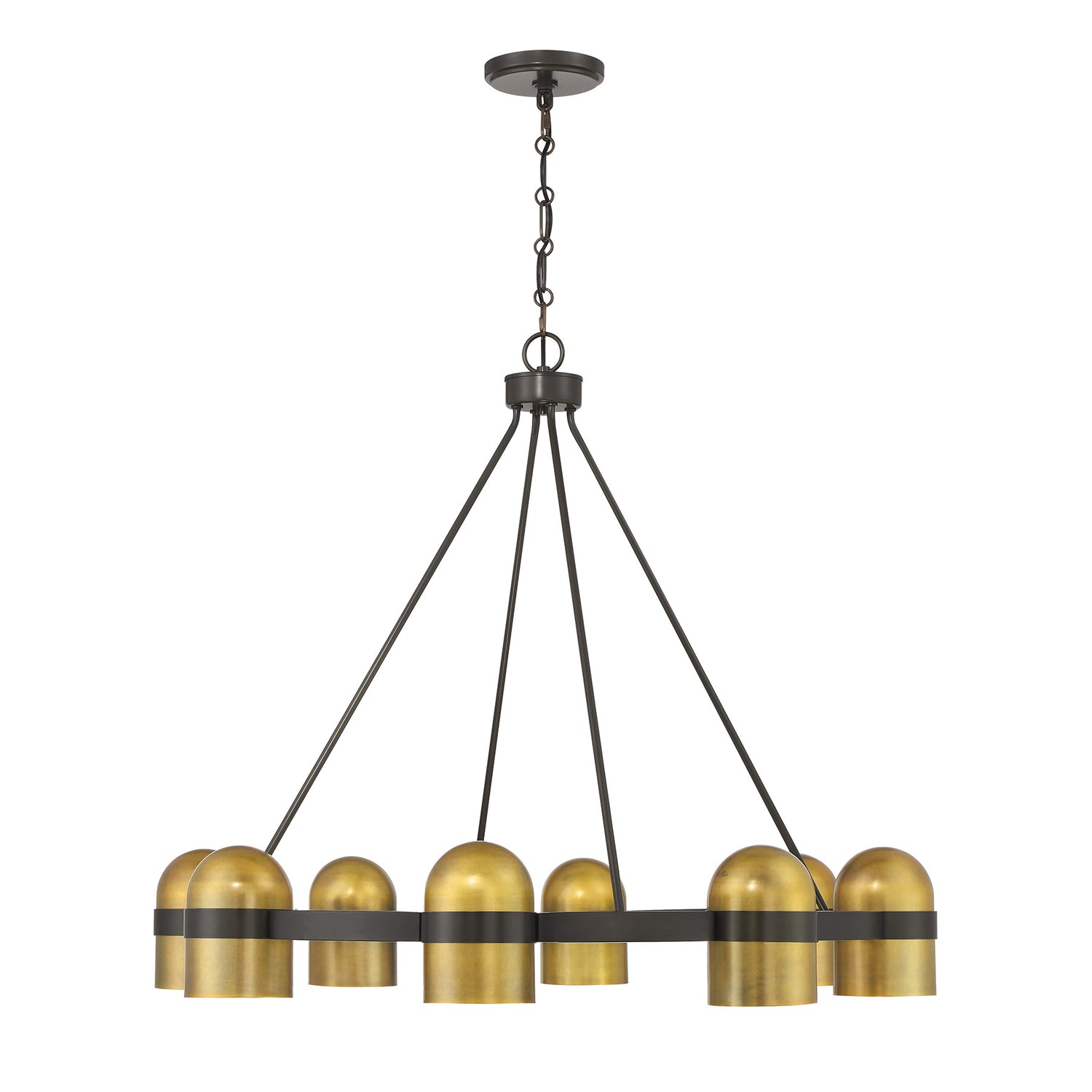 Looking for cool, chic, contemporary lighting? Look no further than the Savoy House Andover 8-light chandelier! It offers up concentrated, focused lighting from bullet-shaped solid metal shades that wear a Riviera Brass finish. When paired with the Mediterranean Bronze finish of the structure, you get fabulous two-tone appeal. Andover is 29.875" in height and 35" in width. It uses eight G9 bulbs of up to 60 watts per bulb. Bulbs not included. Comes with 120" of chain and 144" of cord.