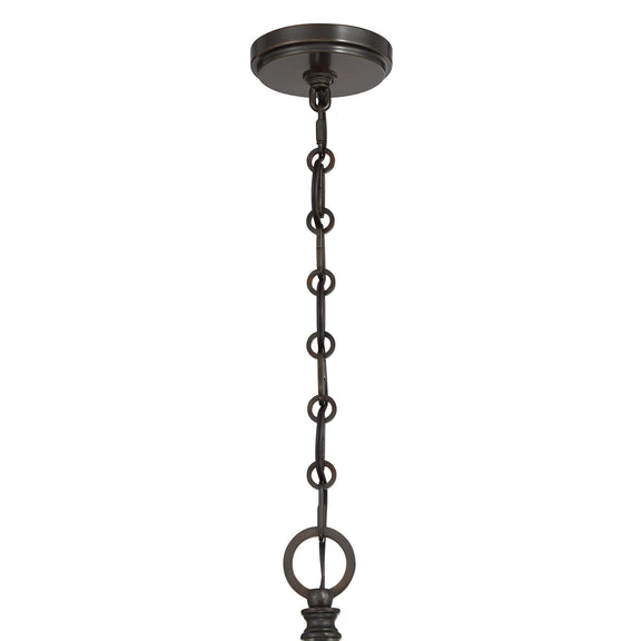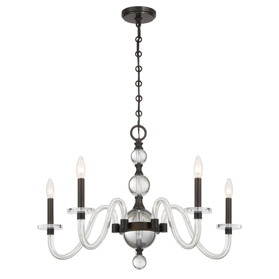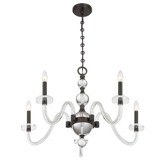 Bring the stately style of the Savoy House Aragon 5-light chandelier into your home and create a space fit for royalty! Its elegantly curving arms and parts of its center column are fashioned from clear glass, which modernizes a traditional silhouette, while the Mediterranean Bronze finish adds richness. Aragon is 19.75" in height and 29" in width. It uses five candelabra size bulbs of up to 60 watts per bulb. Bulbs not included. Comes with 120" of chain.