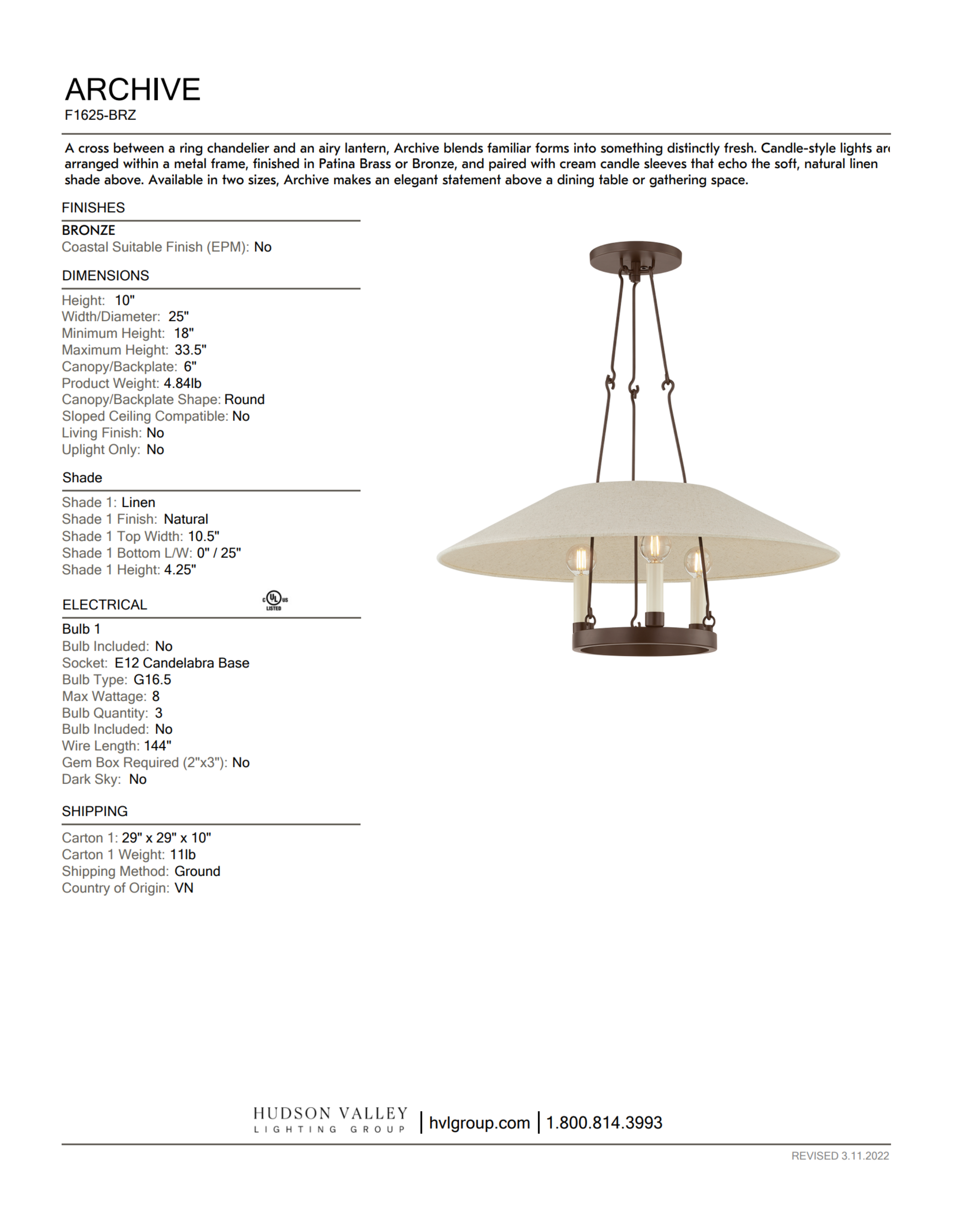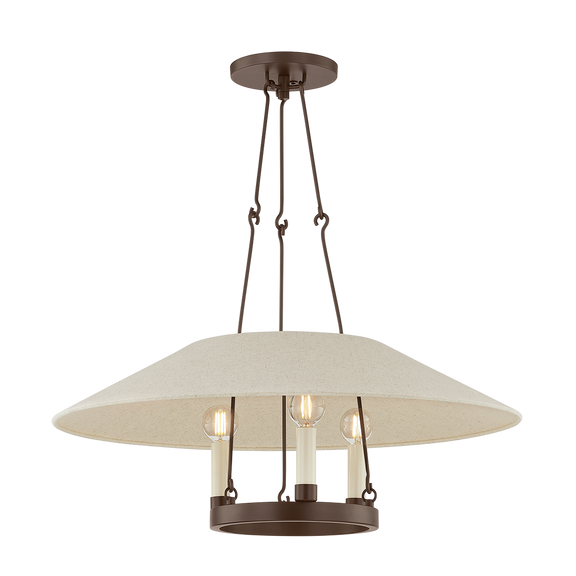 A cross between a ring chandelier and an airy lantern, Archive blends familiar forms into something distinctly fresh. Candle-style lights are arranged within a metal frame, finished in Patina Brass or Bronze, and paired with cream candle sleeves that echo the soft, natural linen shade above. Available in two sizes, Archive makes an elegant statement above a dining table or gathering space.