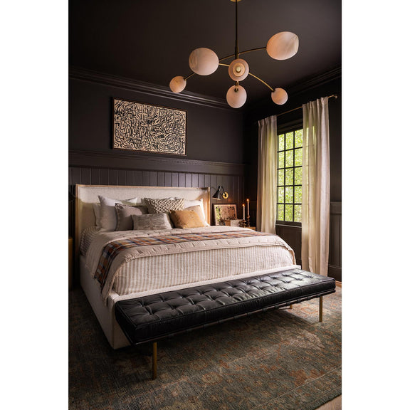 Artemis blends sleek design with the allure of artisan-crafted glass. Its open-ended Alabaster-like glass globes add moody sophistication, creating a captivating and unique ambiance. Inspired by the concept of a mobile, Artemis features gracefully balanced arches in a natural brass finish, making it both a functional light source and a stunning piece of modern art.