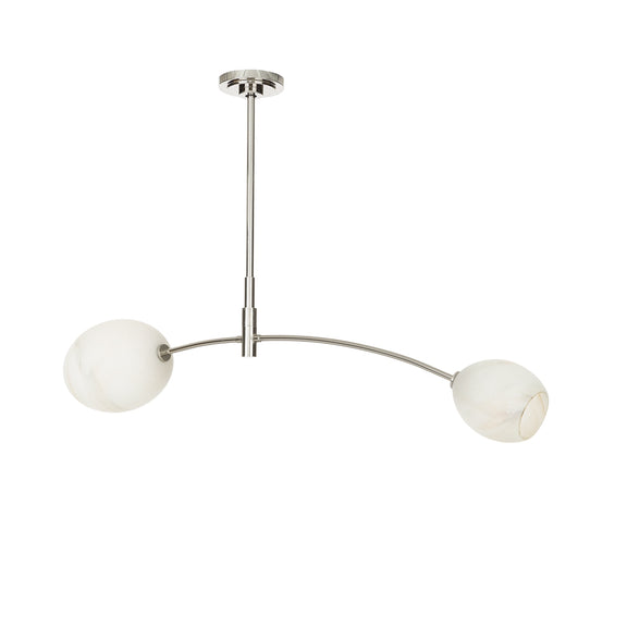 The Artemis Double Pendant masterfully balances simplicity with artisanal craftsmanship, featuring open-ended, alabaster like glass globes elegantly positioned at each end of its mobile-inspired, arched arm in polished nickel finish. This striking fixture exudes a modern vibe, making it a standout addition to any space.