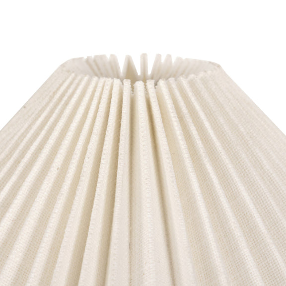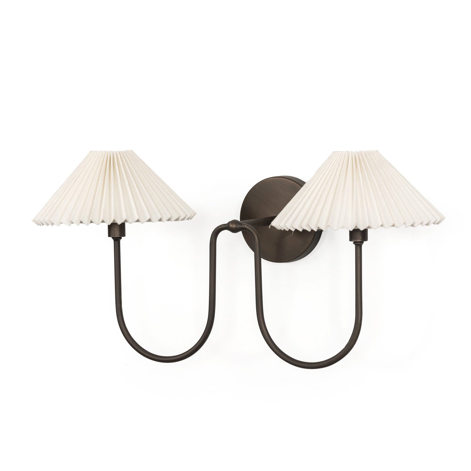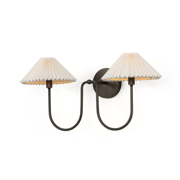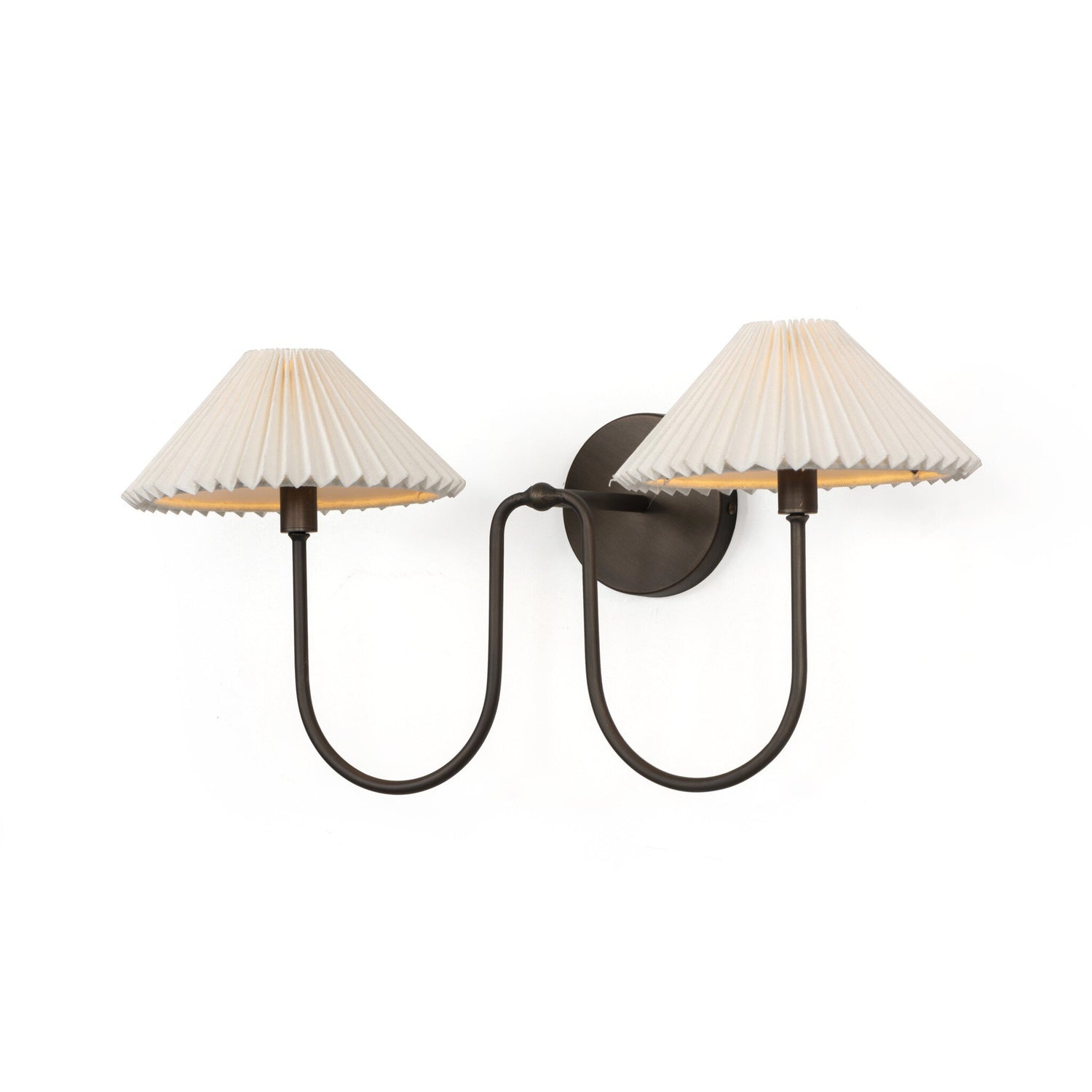 French inspiration courses this slim double sconce, as two curved bronzed arm extend from an iron backplate. Cream, accordion-pleated linen shades allow for a softened, more ambient light. T6 bulb recommended.