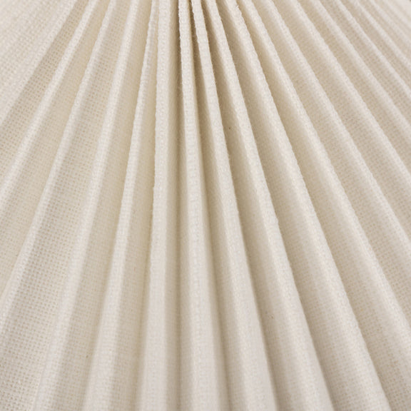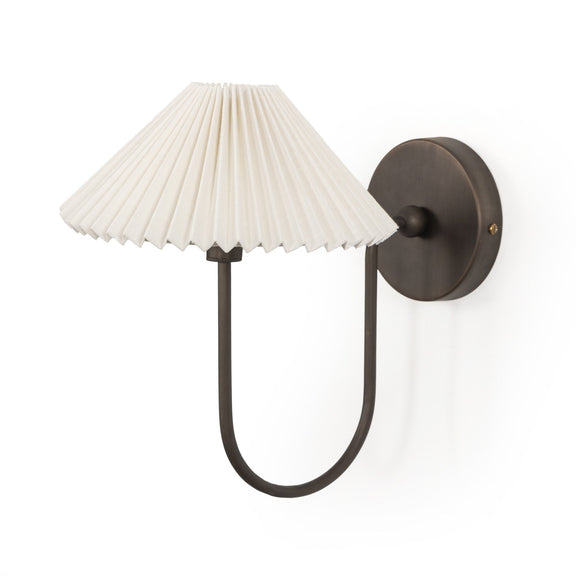 French inspiration courses this slim sconce, as a curved bronzed arm extends from an iron backplate. Cream, accordion-pleated linen shade allows for a softened, more ambient light. T6 bulb recommended.