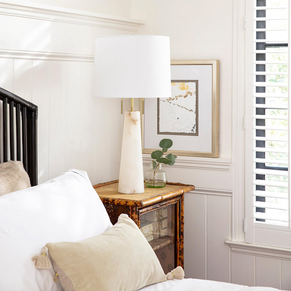 The Austen Alabaster Table Lamp combines the classic look of alabaster stone with a modern, conical shape and natural brass finish, with sleek rectangular pulls. Place the Austen in a transitional bedroom, modern living area, or classic entryway for a bit of natural warmth.