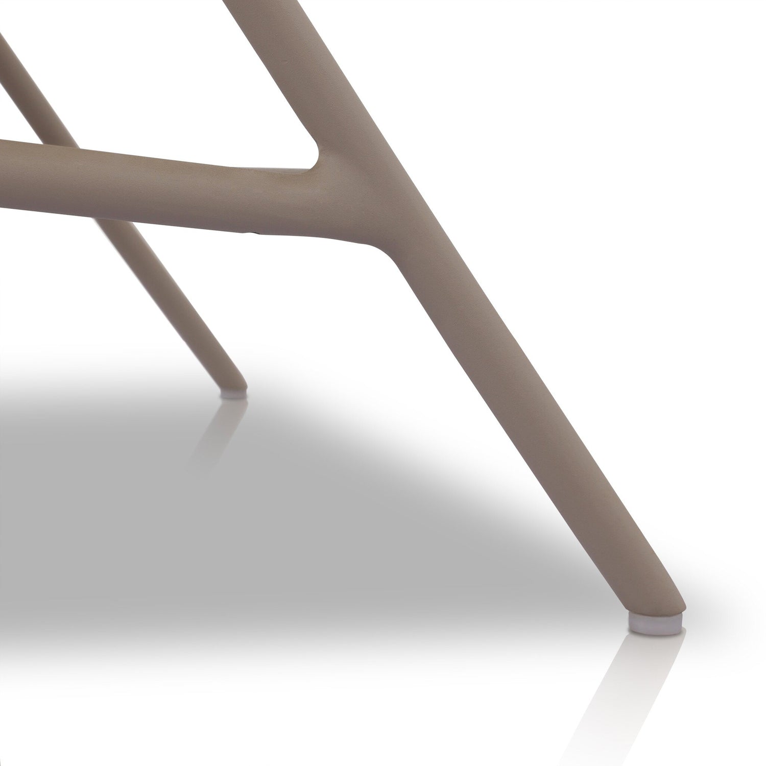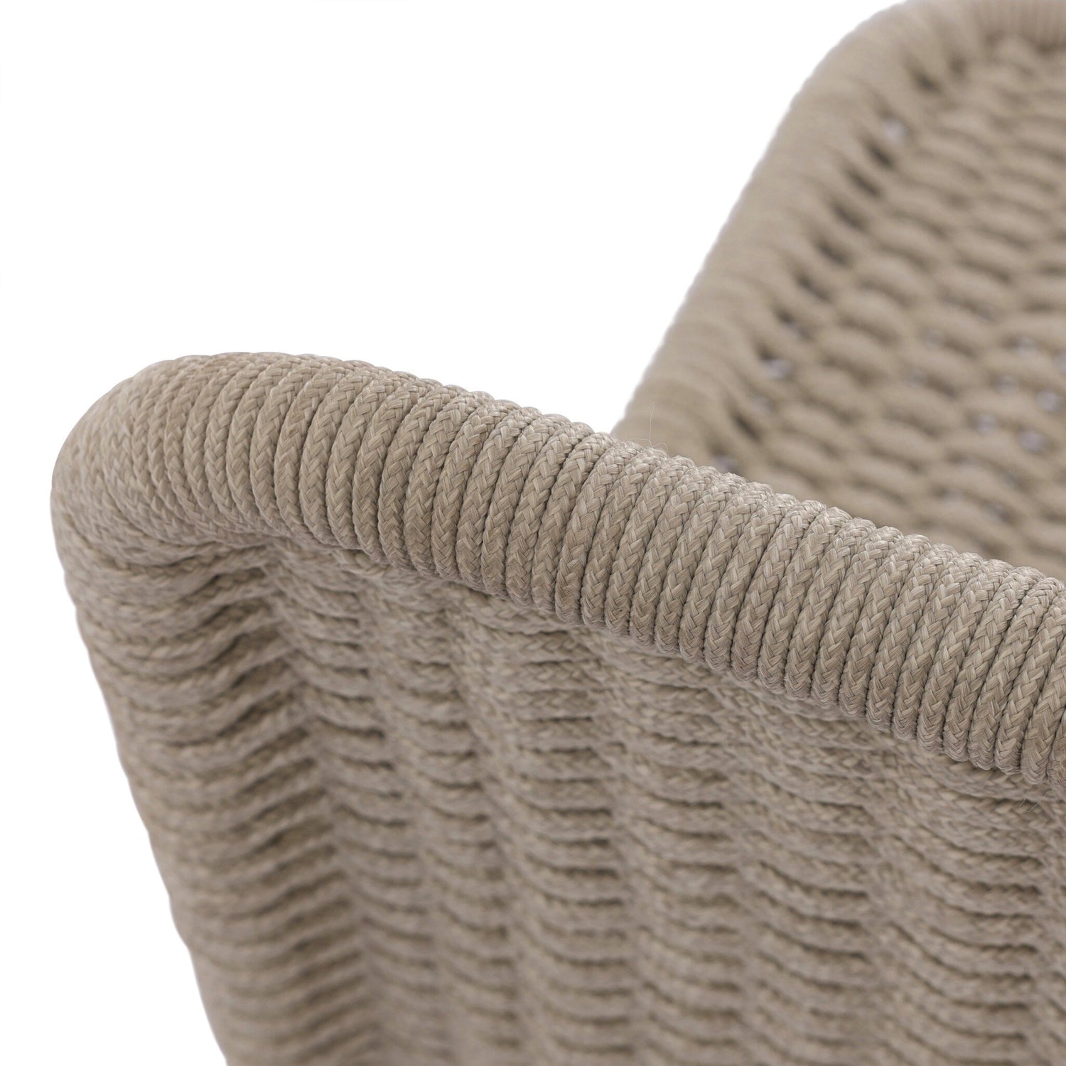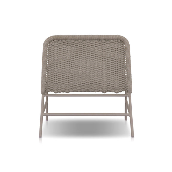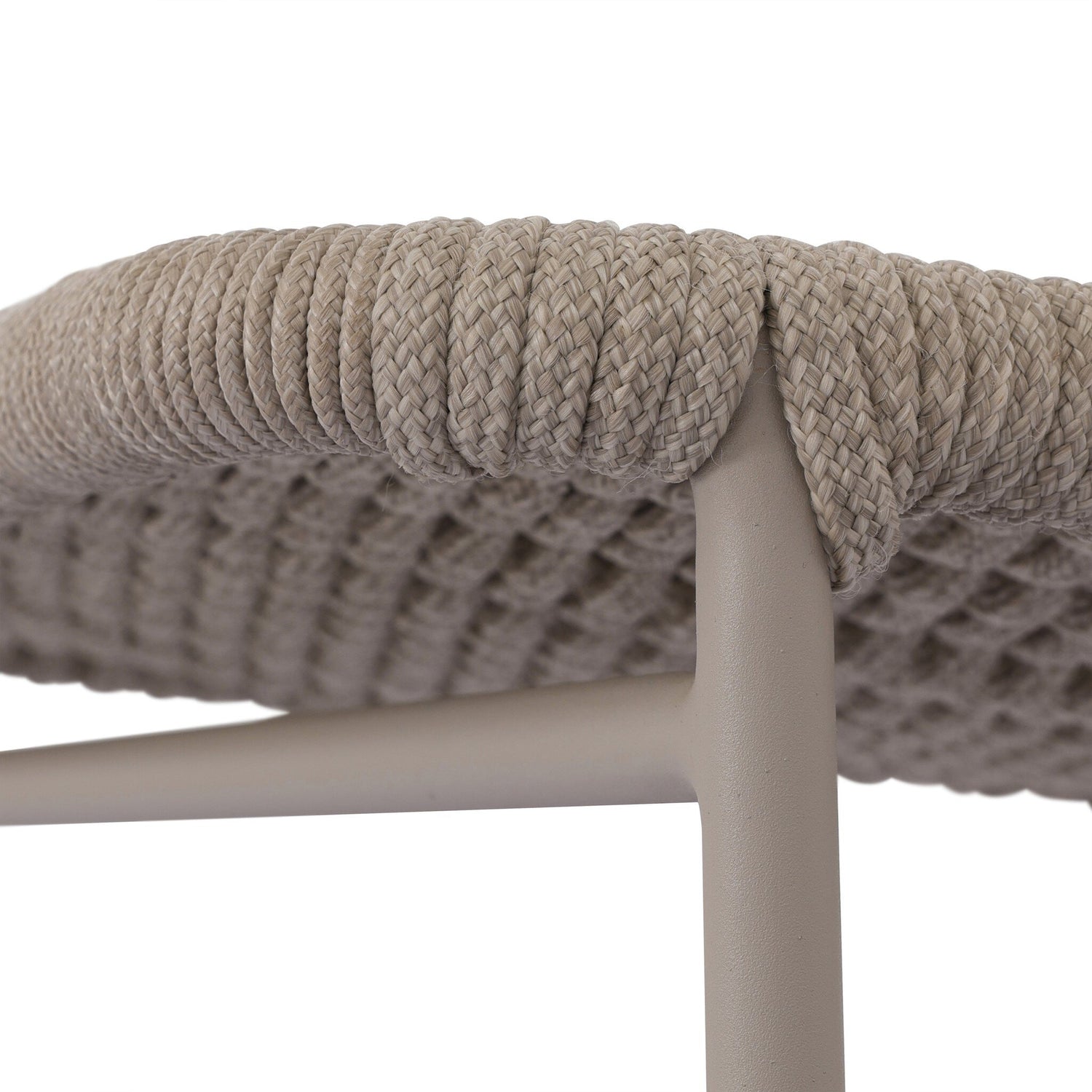 A simple, textural take on outdoor-friendly seating. Black-finished aluminum armless framing welcomes dark grey rope, for a sleek look with underlying depth. Cover or store indoors during inclement weather and when not in use.
