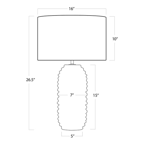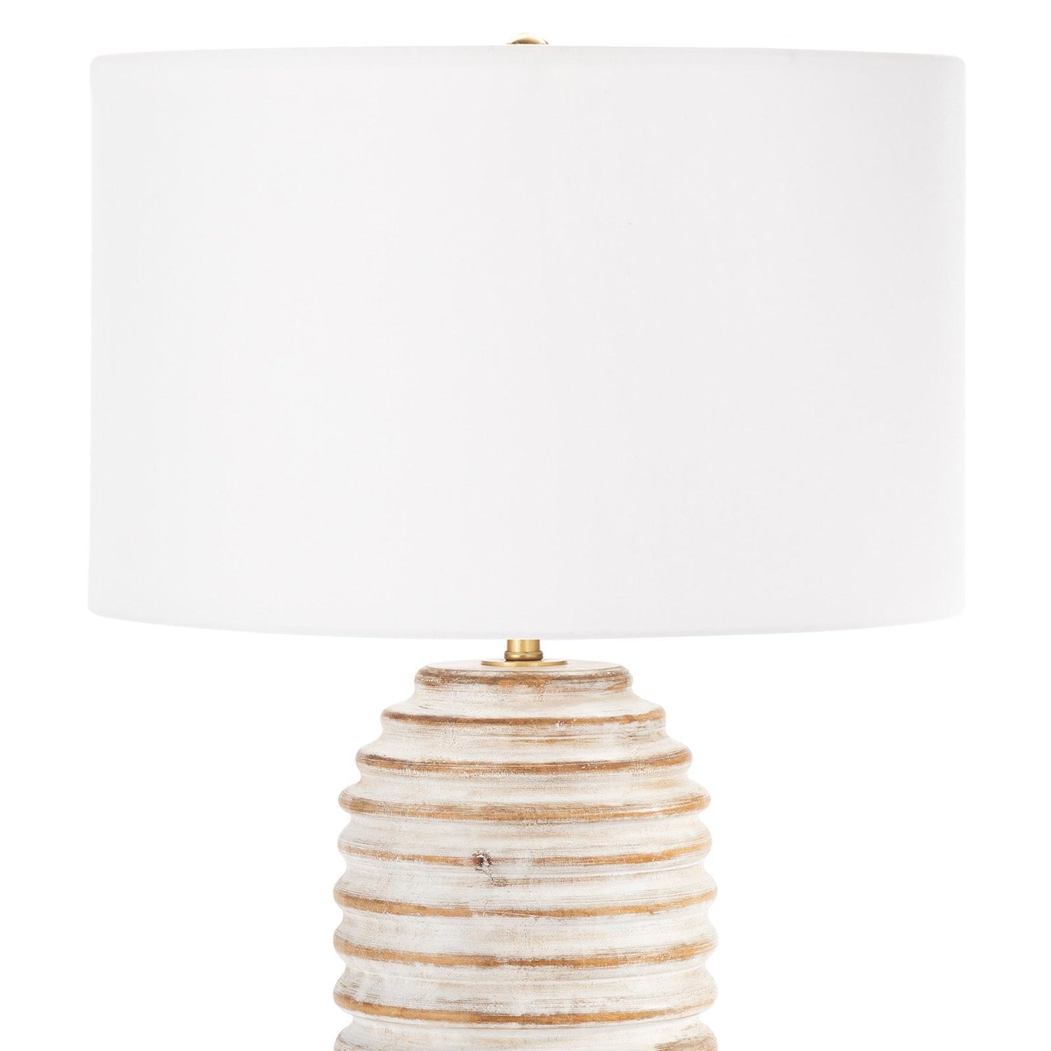 The Carmel Table Lamp's wood body is white-washed and distressed like driftwood that has been aged by the sun and sea. Carved ridges run along the entire body of the lamp, which is topped with a large drum shade and natural brass ball finial. Whether in a relaxed coastal retreat or a neutral bedroom getaway, the Carmel Lamp will provide both sculptural interest and beautiful, warm lighting to your space.