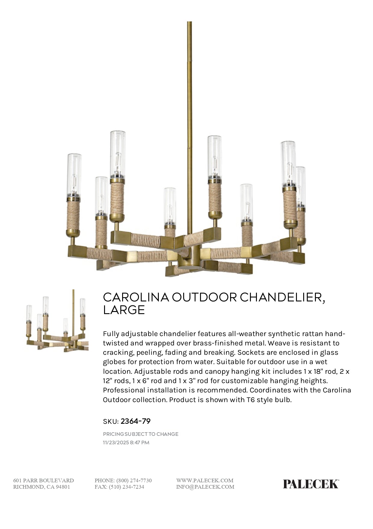 Fully adjustable chandelier features all-weather synthetic rattan hand-twisted and wrapped over brass-finished metal. Weave is resistant to cracking, peeling, fading and breaking. Sockets are enclosed in glass globes for protection from water. Suitable for outdoor use in a wet location. Adjustable rods and canopy hanging kit includes 1 x 18" rod, 2 x 12" rods, 1 x 6" rod and 1 x 3" rod for customizable hanging heights. Professional installation is recommended. Coordinates with the Carolina Outdoor collection. Product is shown with T6 style bulb.