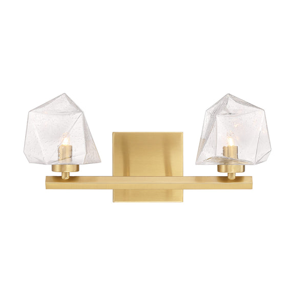 The Castello 2-light bath light from Savoy House is cool as ice! Its sharply cut shades of clear hammered glass add a bright touch of geometry and texture, pairing perfectly with the thick arm and backplate that is finished in Warm Brass. Castello is 6.5" in height, 15" in width and extends 6.5" from the wall. Uses two LED G9 bulbs. Bulbs not included.