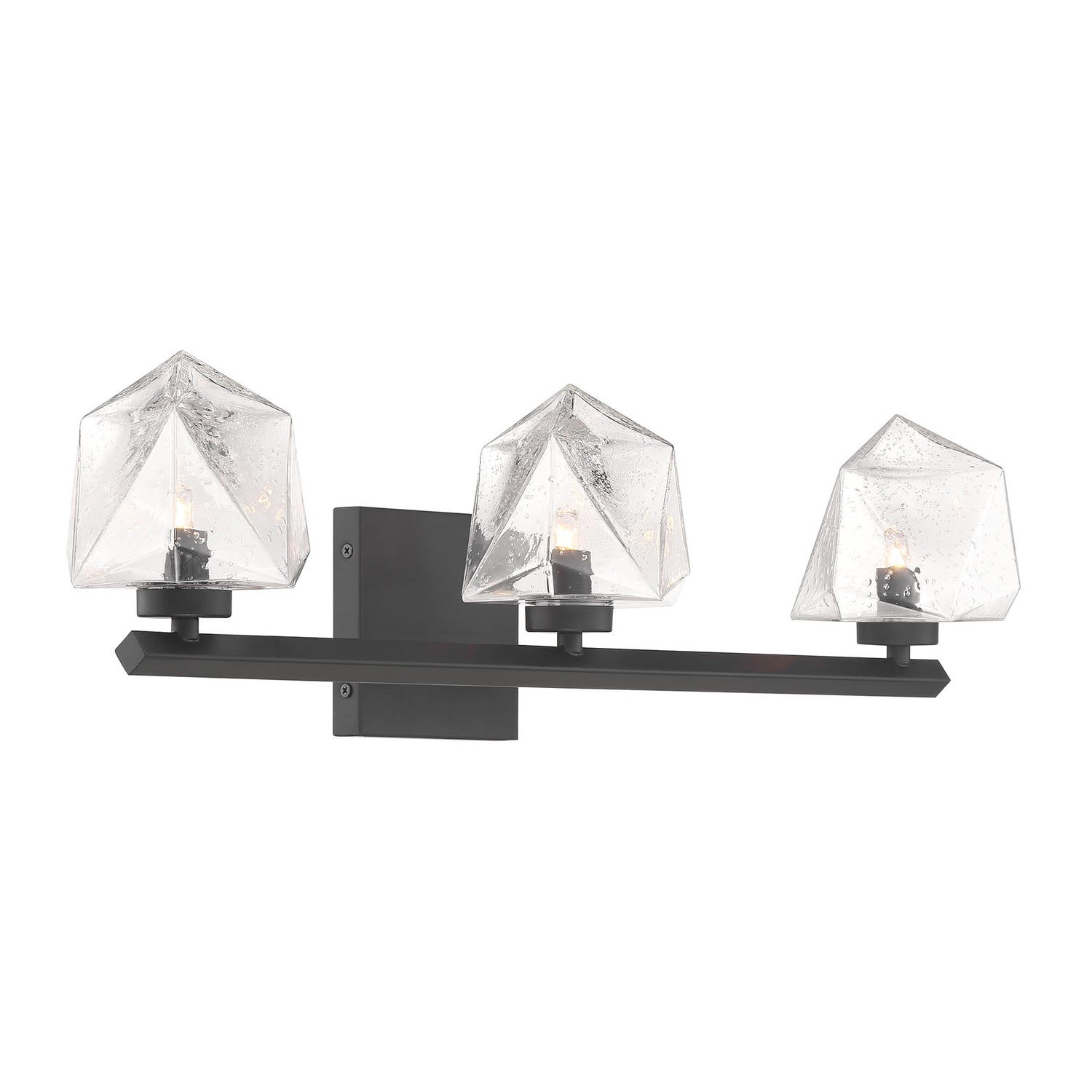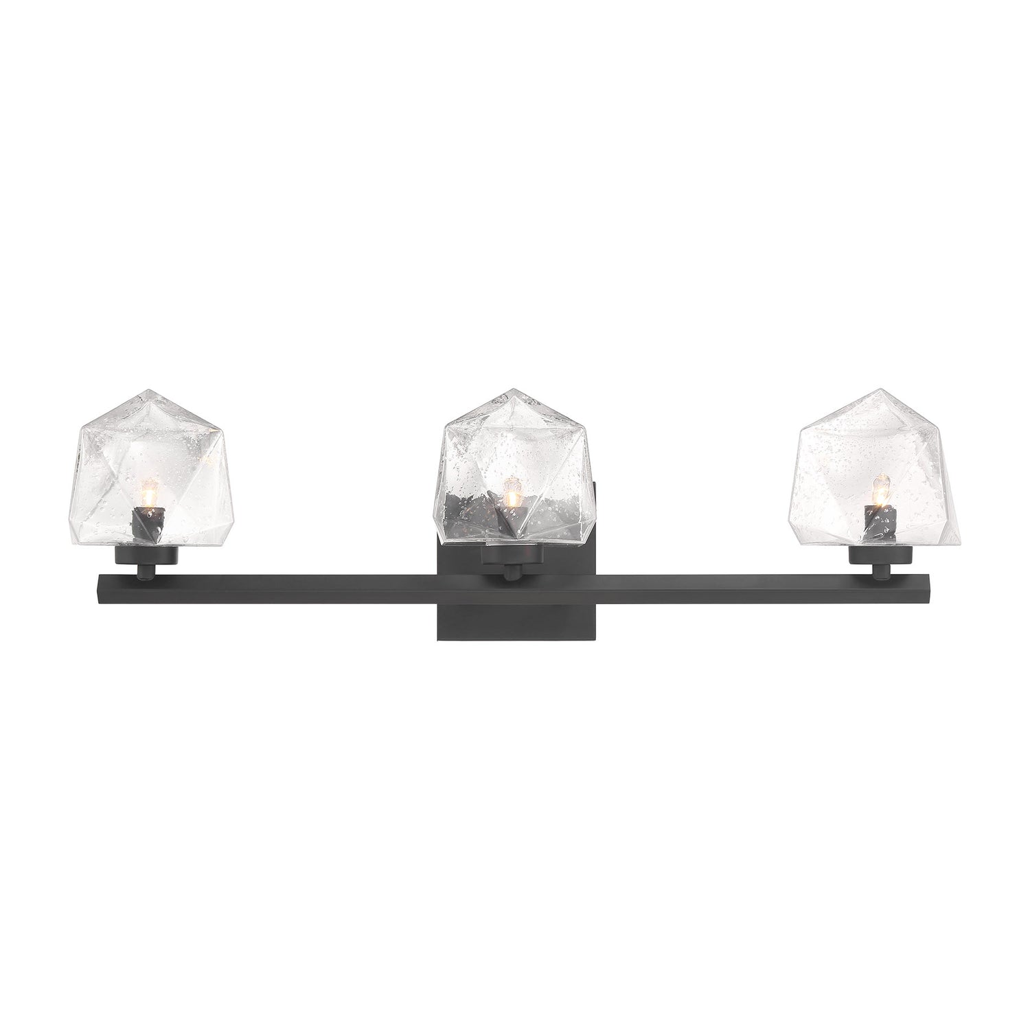 The Castello 3-light bath light from Savoy House is cool as ice! Its sharply cut shades of clear hammered glass add a bright touch of geometry and texture, pairing perfectly with the thick arm and backplate that is finished in Warm Brass. Castello is 6.5" in height, 25" in width and extends 6.5" from the wall. Uses three LED G9 bulbs. Bulbs not included.