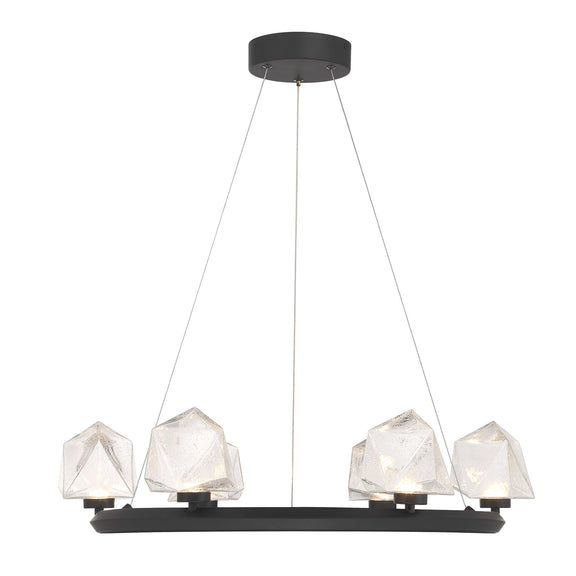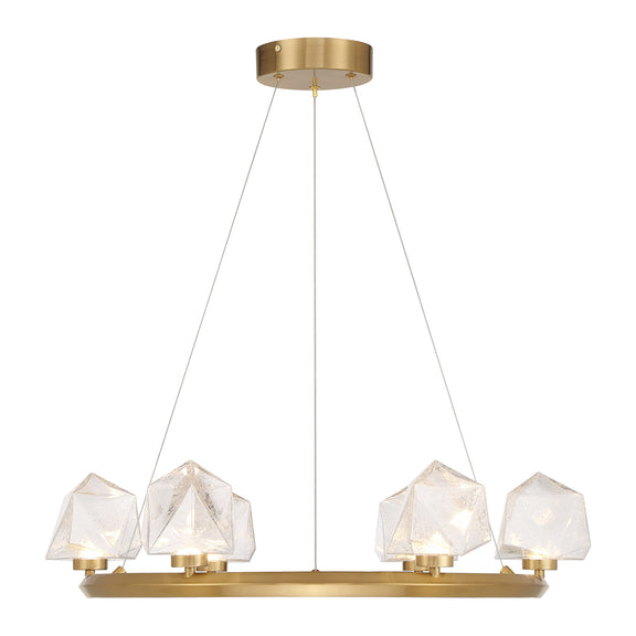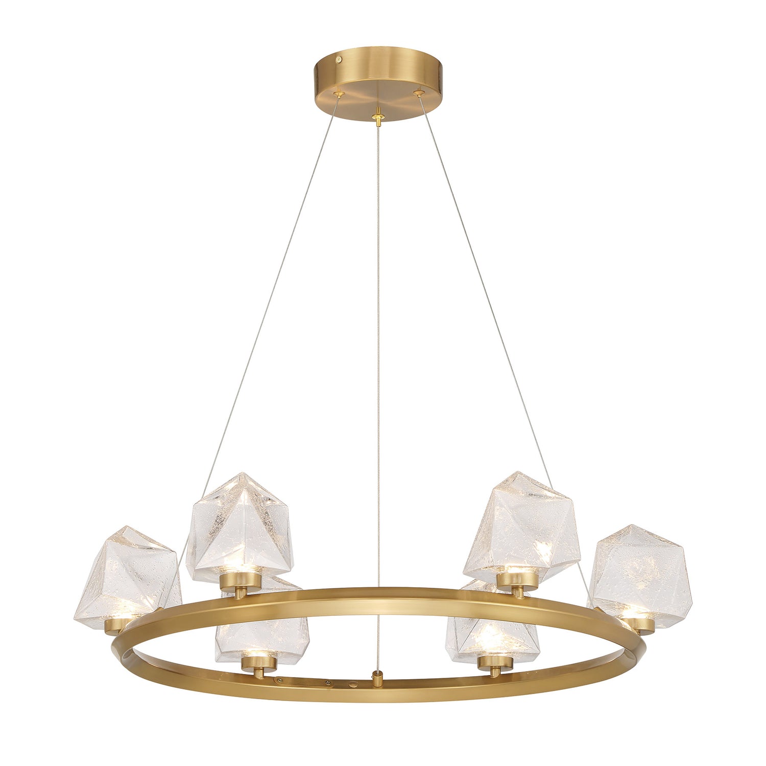 The Castello 6-light chandelier from Savoy House is cool as ice! Its sharply cut shades of clear hammered glass add a bright touch of geometry and texture, pairing perfectly with the thick hoop-shaped structure that is finished in Warm Brass. When the glass is illuminated by the integrated LED light sources, it will truly shine. Super slender hanging cords ensure that your attention stays on the sleek, contemporary design. Castello is 26.5" in width and has an adjustable height ranging from 6" to 126".