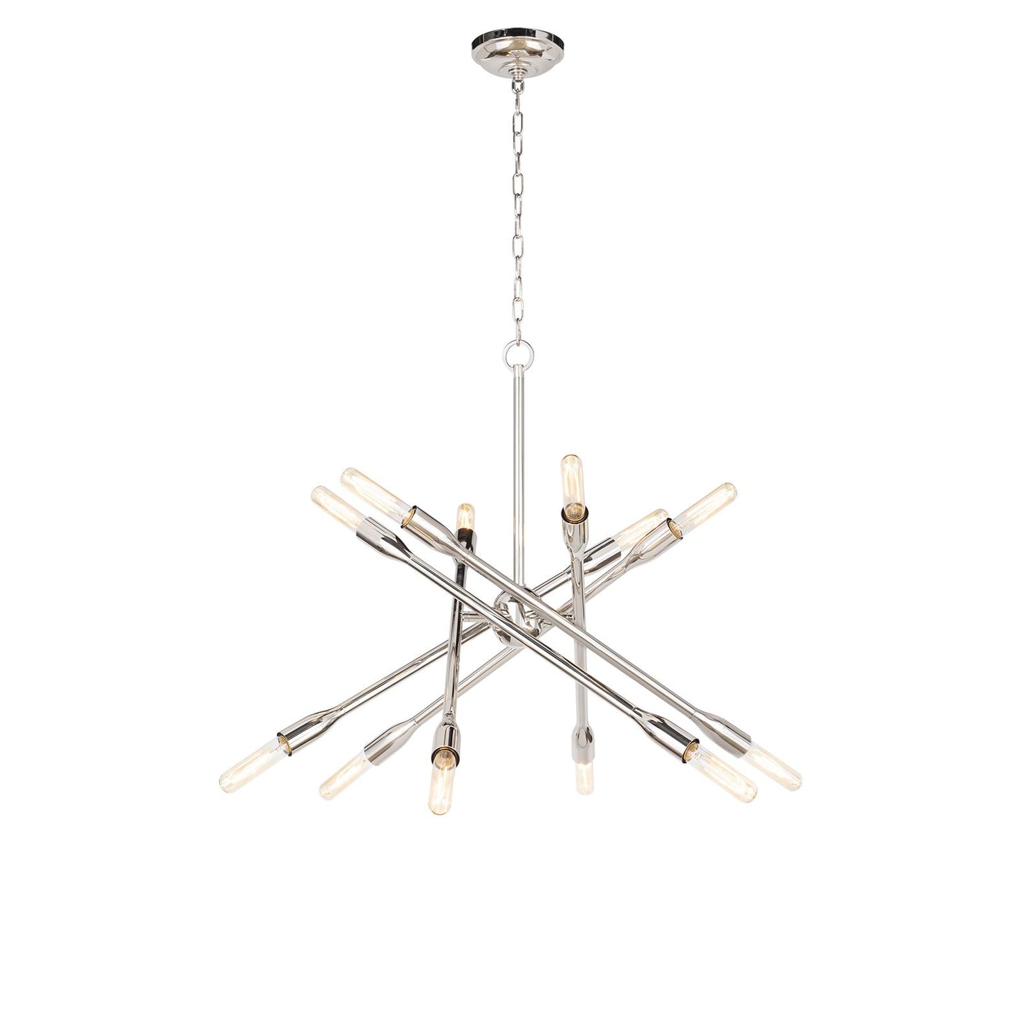 Modern metal arms crisscross in the air, meeting at different angles to make up this striking chandelier. The Cobra’s sleek design brings a vintage vibe to the intentionally random design of the piece, and the size adds to its versatility, making it ideal for entryways or smaller rooms. Try this fixture with Vintage T Bulbs for an impactful silhouette.