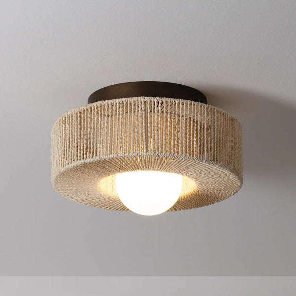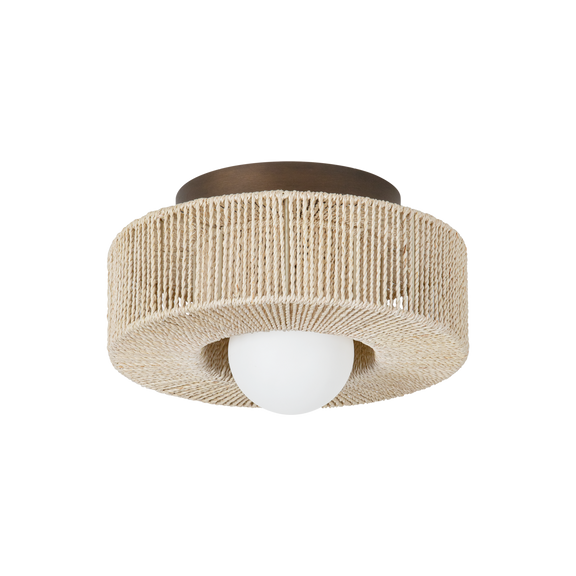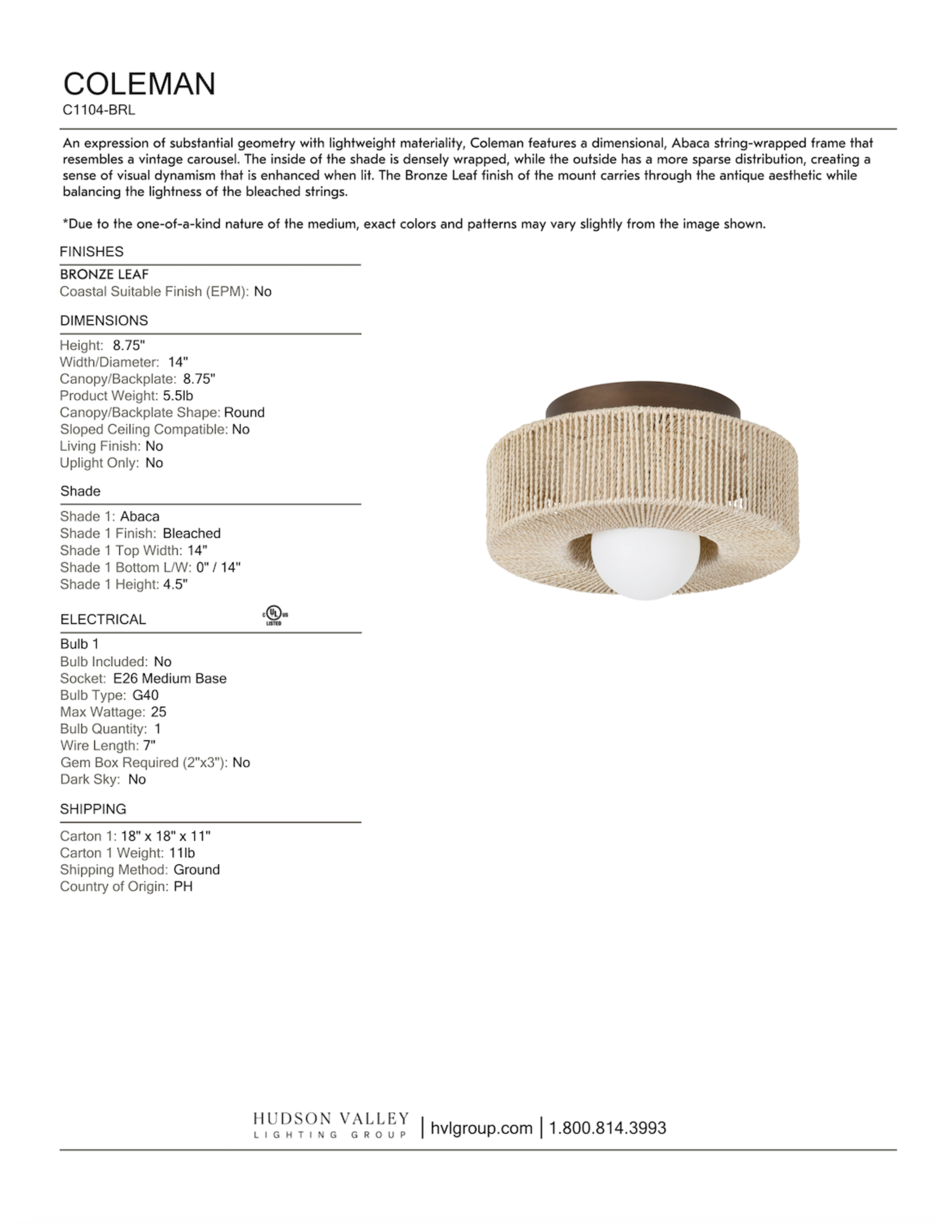 An expression of substantial geometry with lightweight materiality, Coleman features a dimensional, Abaca string-wrapped frame that resembles a vintage carousel. The inside of the shade is densely wrapped, while the outside has a more sparse distribution, creating a sense of visual dynamism that is enhanced when lit. The Bronze Leaf finish of the mount carries through the antique aesthetic while balancing the lightness of the bleached strings.