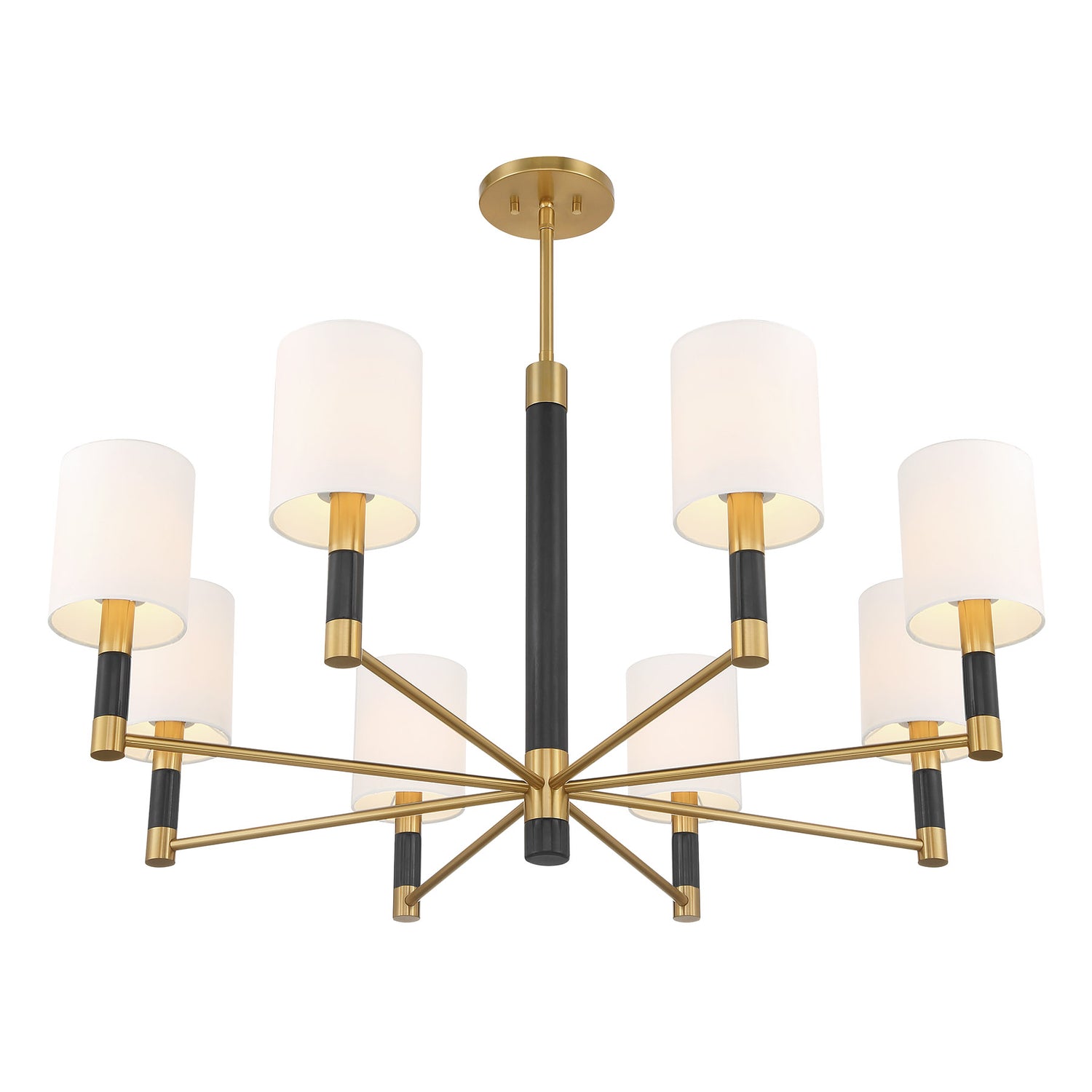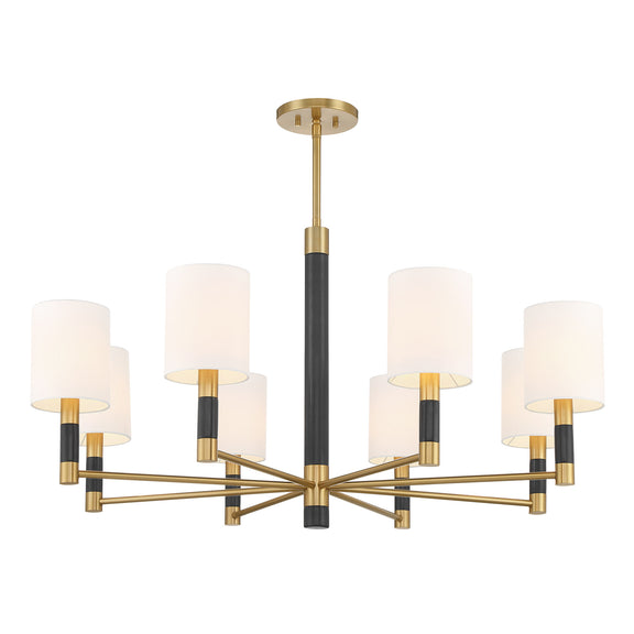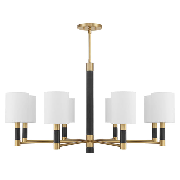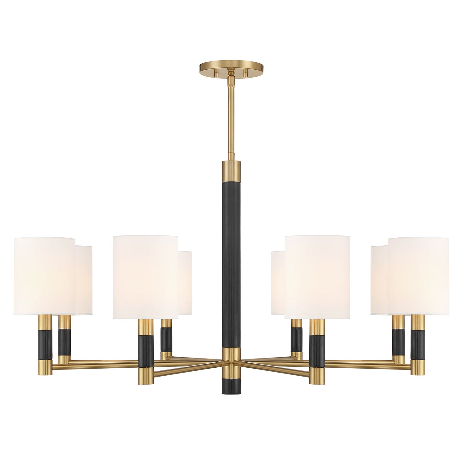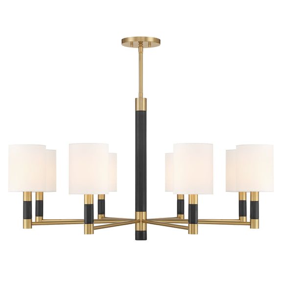 An enduring chandelier shape is adorned with beautiful black marble in the Savoy House Conrad 8-light chandelier, creating a design that will stand the test of time. Each piece of marble is unique and will feature different veining patterns! Crisp white fabric shades and a Warm Brass finish complete the look. Conrad is 22.375" in height and 40" in width. It uses eight candelabra size bulbs of up to 60 watts per bulb. Bulbs not included. Comes with four 12-inch downrods and one 6-inch downrod.