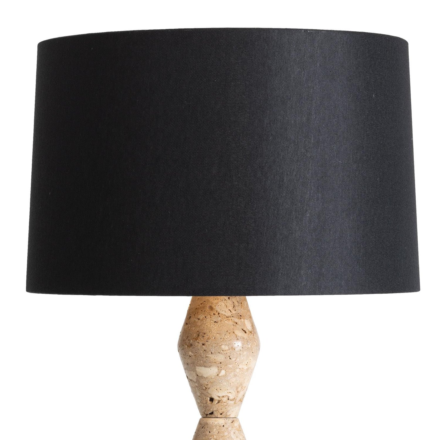 The Crew Travertine Buffet Lamp has a striking geometric travertine base set in neutral tones that evokes hand turned details. The fixture is crowned with an elegant black linen shade with a gold liner, making this a stately piece for a wide range of buffet furniture. Crew's overall vibe is distinctly mid-century modern.