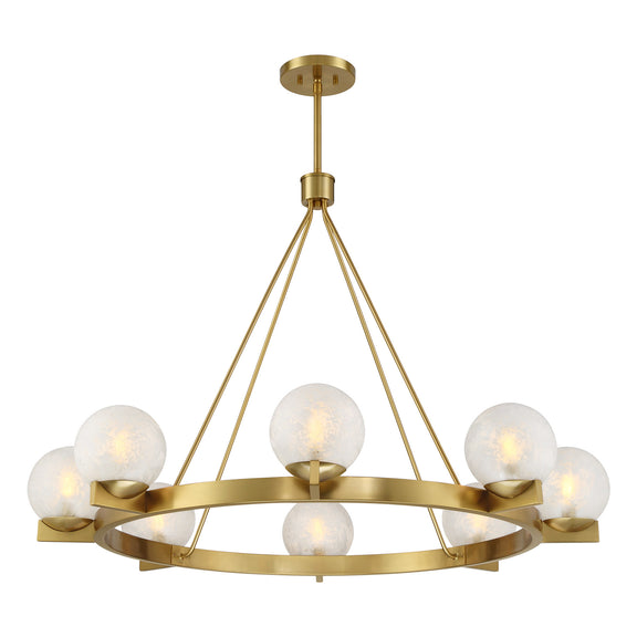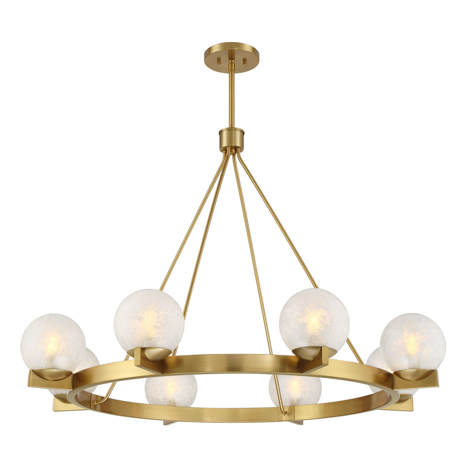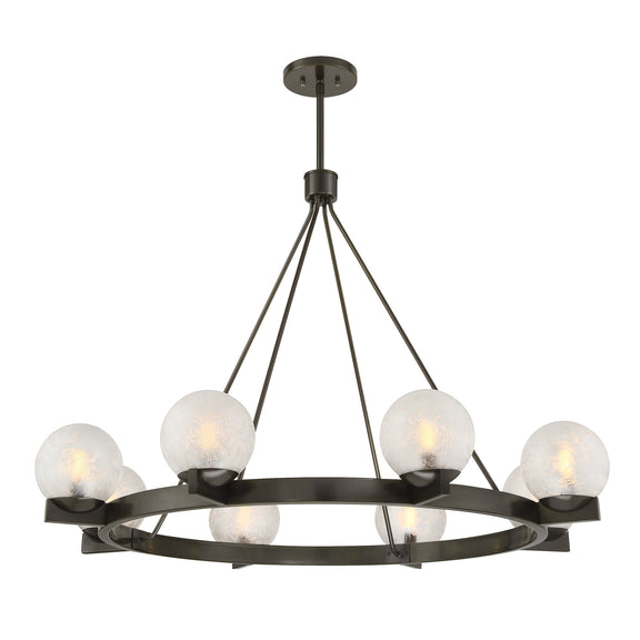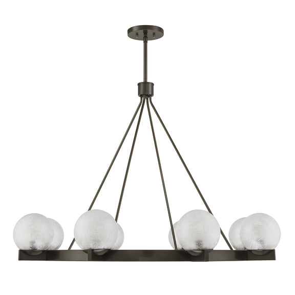 The Savoy House Darien is a 8-light chandelier with fabulously chilly appeal. A minimal, circular frame is finished in bold Mediterranean Bronze and holds eight orbs of Ice Glass, adding sub-zero cool with tons of frosty texture. Darien is 42" in width and has an adjustable height ranging from 29" to 83". Uses eight candelabra size bulbs of up to 60 watts per bulb. Bulbs not included. Comes with four 12" downrods and one 6" downrod.