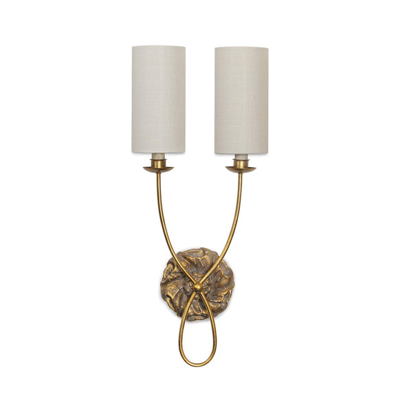 Elevate your decor with the Dominique Double Sconce, a seamless fusion of antique and modern design. This sconce features gracefully curved arms that loop into each other, supporting two elongated shades. The antique-inspired candles with bobeches are mounted on a detailed backplate, adding a touch of vintage elegance while holding the shades in place. Perfect for styling in dining areas, flanking a mirror, or as a statement piece in a living room, this sconce creates a sophisticated focal point with its unique and refined style.