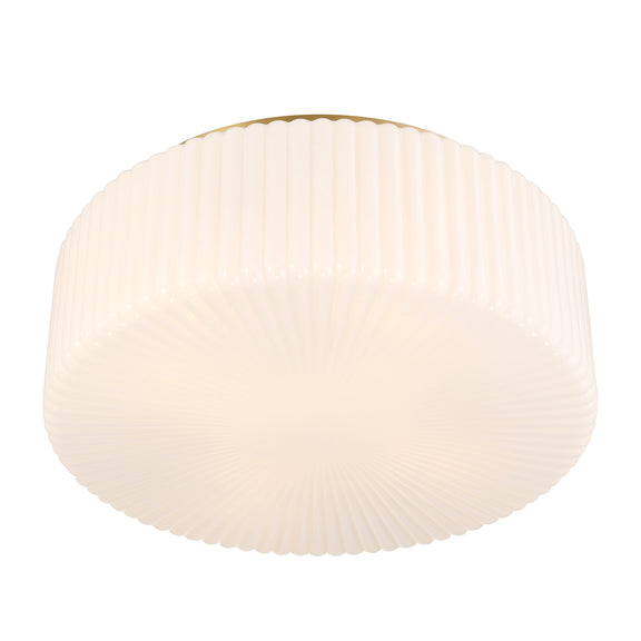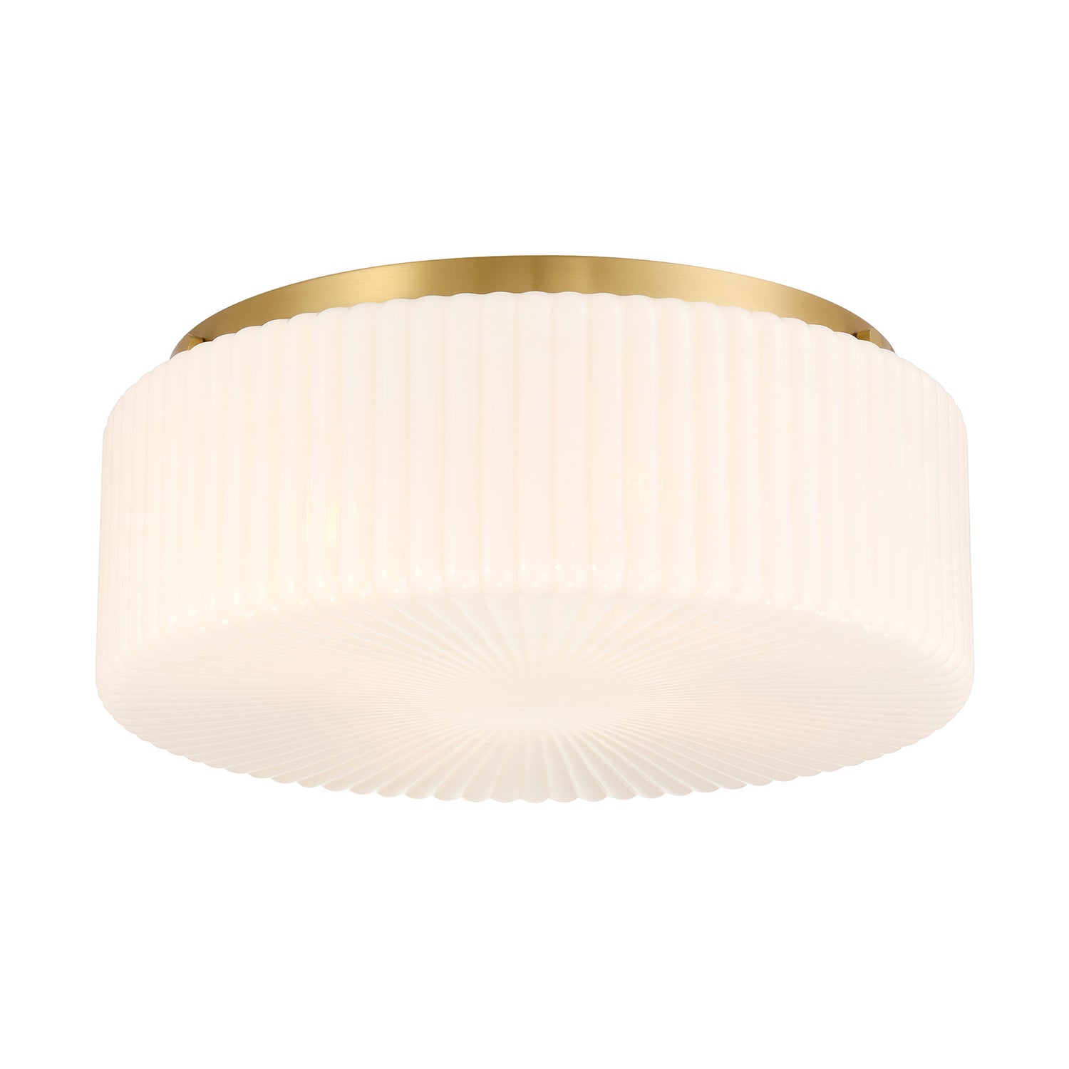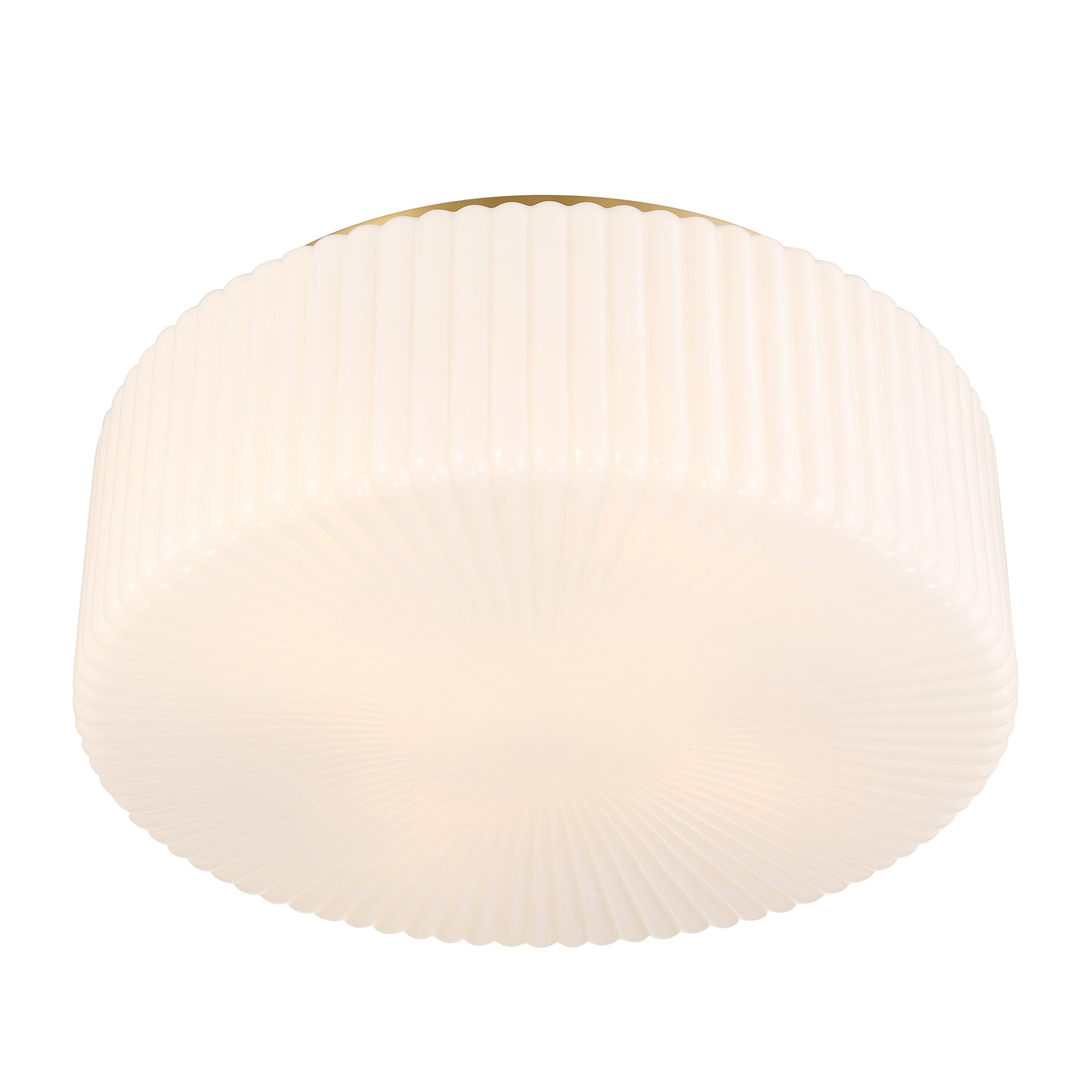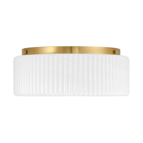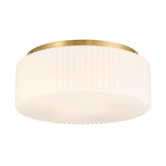 Use the vintage-inspired Savoy House Edgemont 4-light flush mount to add beautiful, vivid brightness to any room! The ribbed shade of strie glass brings in a big dose of eye-catching texture and the Warm Brass finish is extremely versatile. Edgemont is 8" in height and 20" in width, making it an excellent option for larger spaces. It uses four standard size bulbs of up to 60 watts per bulb. Bulbs not included.