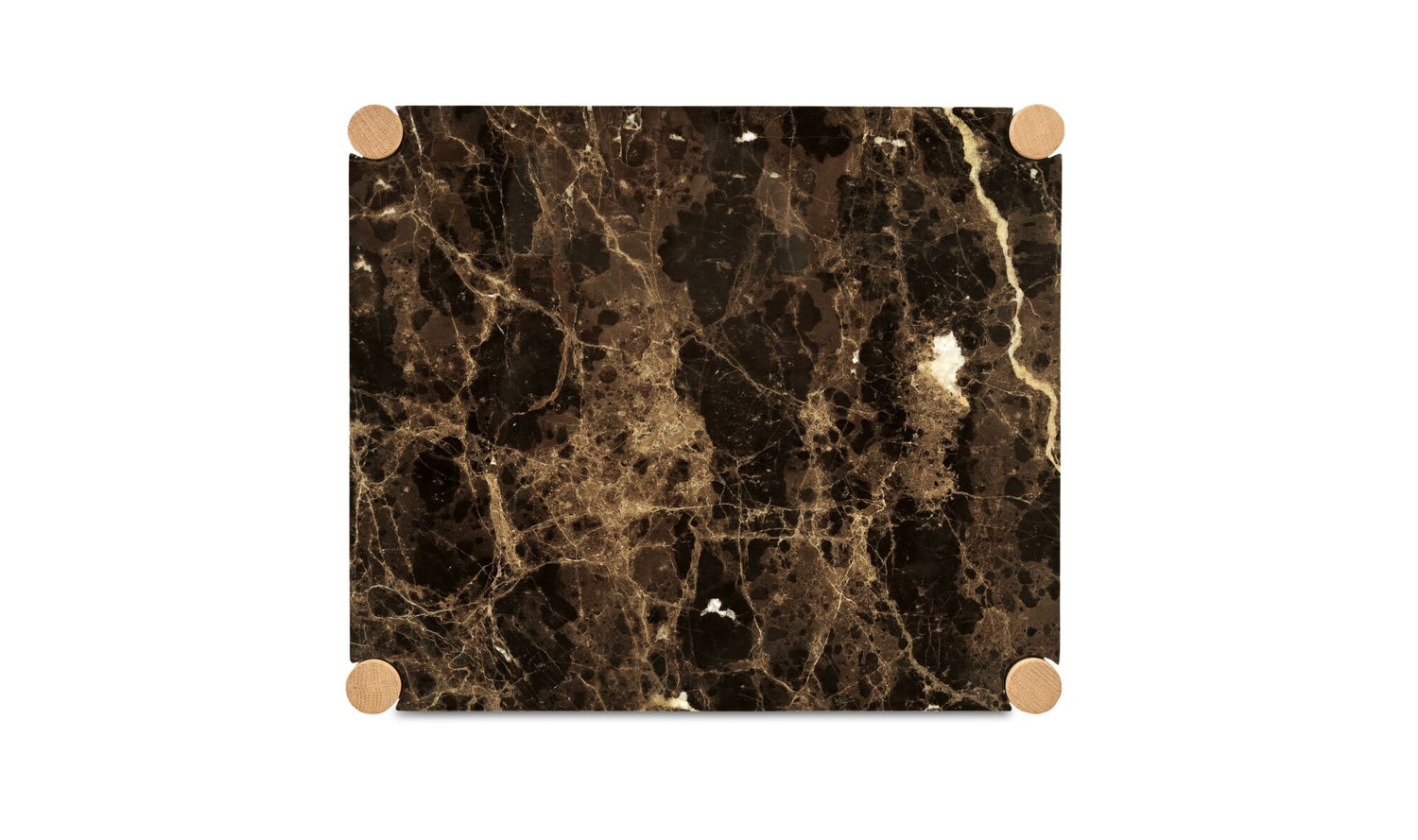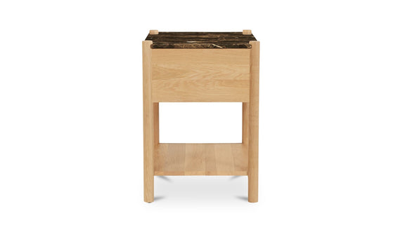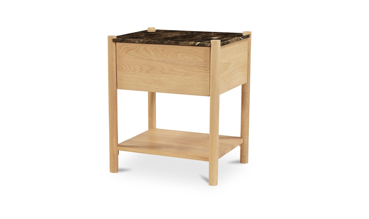 The Elio nightstand embraces the allure of mixed materials with its transitional design. The rich tones of dark Emperador marble harmoniously blend with the natural warmth of oak, creating a piece of understated luxury. A marble top, oak shelf, and soft-close drawer offer both style and functionality. Distinctive post cutouts on the top add visual interest, while unique marble veining ensures each piece is one-of-a-kind.