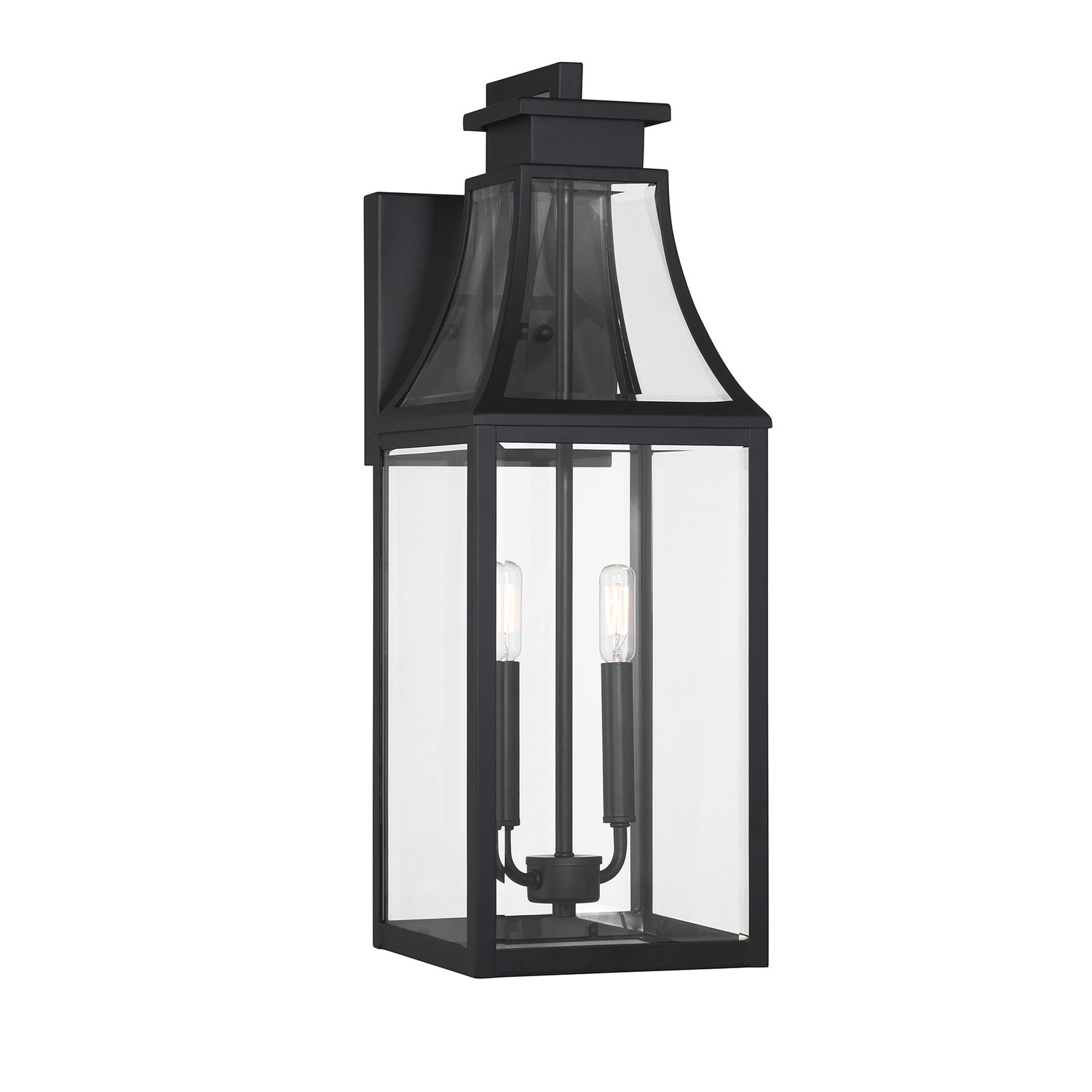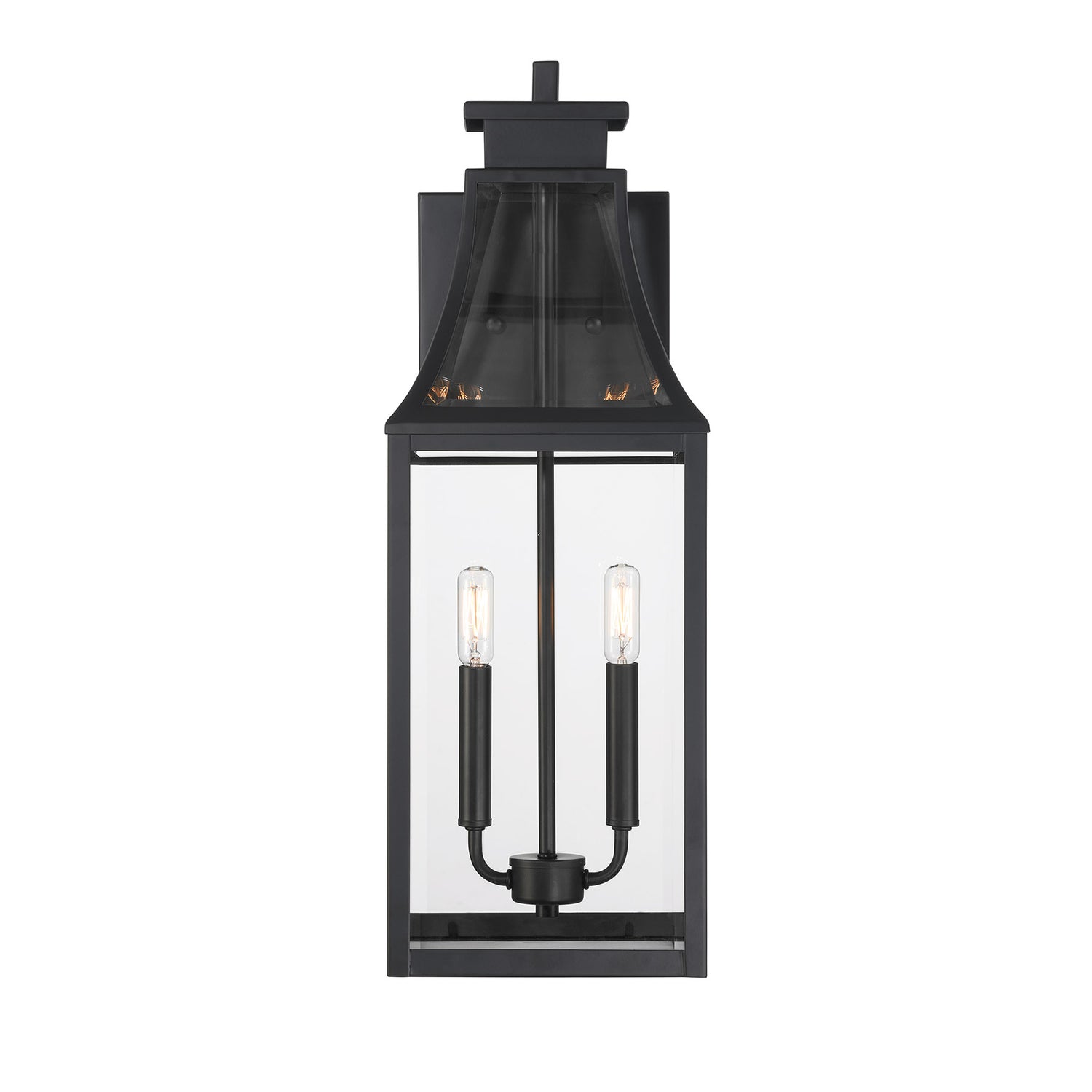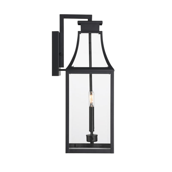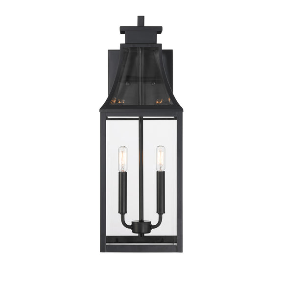 The Savoy House Emery 2-light outdoor wall lantern features a timeless style inspired by charming English cottage homes. Its curving hood and panels are all fitted with clear glass panes that give off a bright glow to light the way. The Matte Black finish is endlessly versatile. Emery is 24" in height, 8.25" in width and extends 10.88" from the wall. Uses two candelabra size bulbs of up to 40 watts per bulb. Bulbs not included. Emery is wet area rated for use in covered or uncovered outdoor areas.