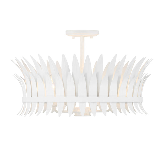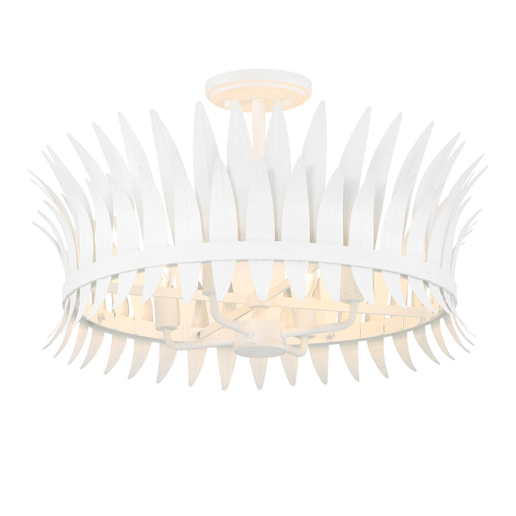 This Savoy House Ensley 4-light ceiling semi-flush mount wears a crown of feather-like decorations with a fashionable Bisque White finish, creating a look that effortlessly adds bright and stylish lighting to any room. Ensley is 13" in height and 20" in width. Uses four candelabra size bulbs of up to 60 watts per bulb. Bulbs not included.