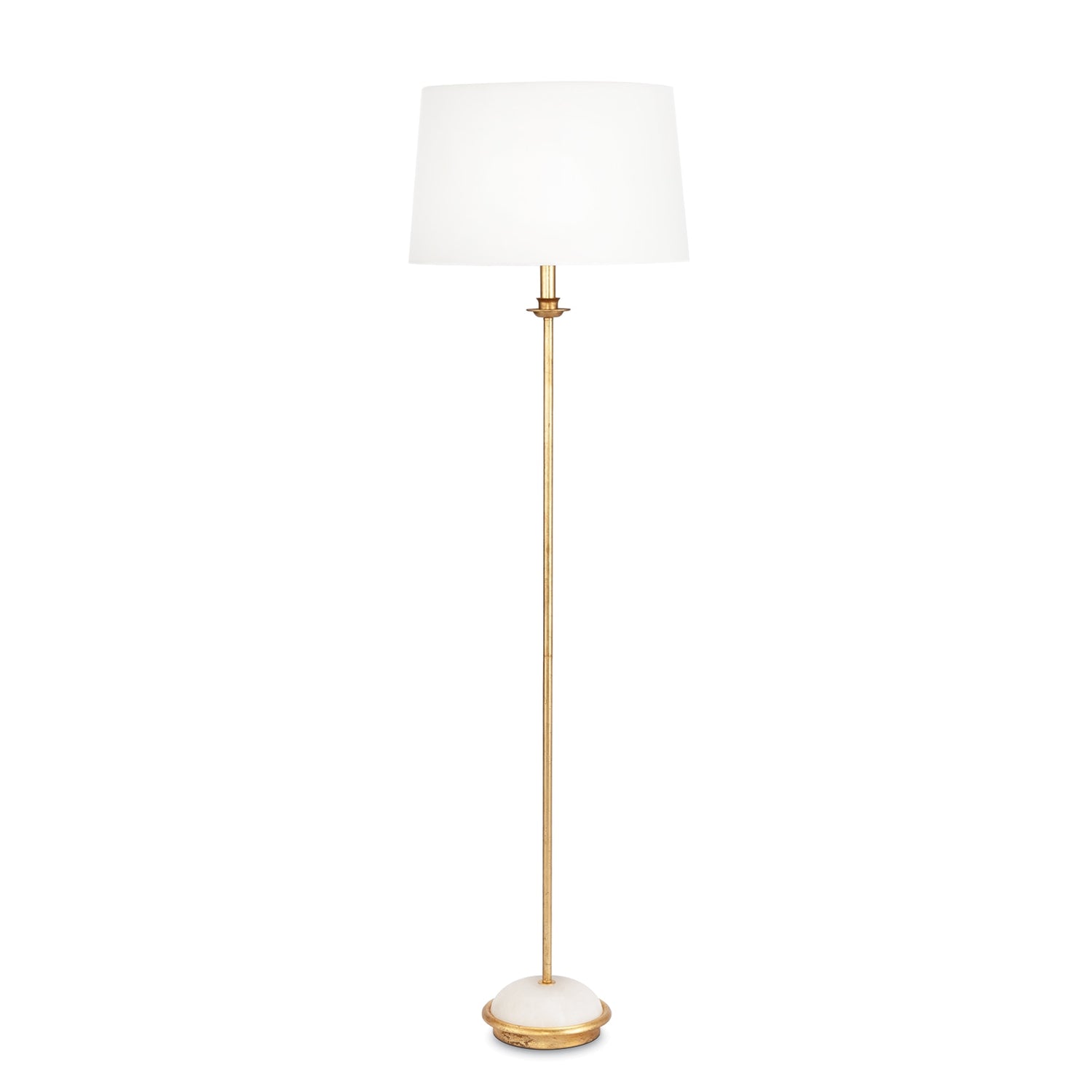 Add elegance and ambiance to your home with the Fisher Floor Lamp. With a gold-leaf finished body and a natural alabaster stone base, this floor lamp is simply beautiful. A natural linen shade completes the refined look, atop a delicate candle cup accent. Place this elegant floor lamp in your living room or home office for a touch of sophistication.