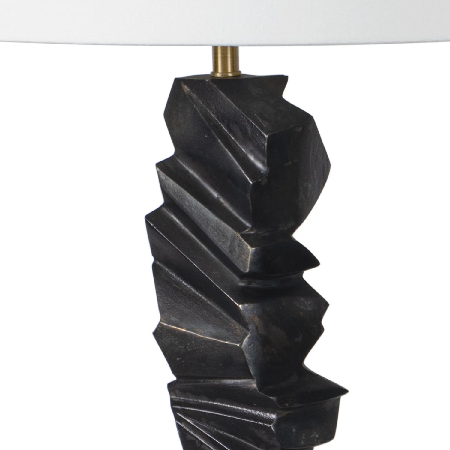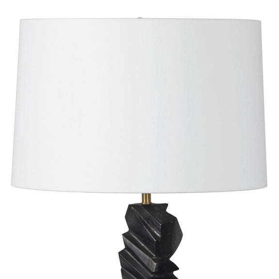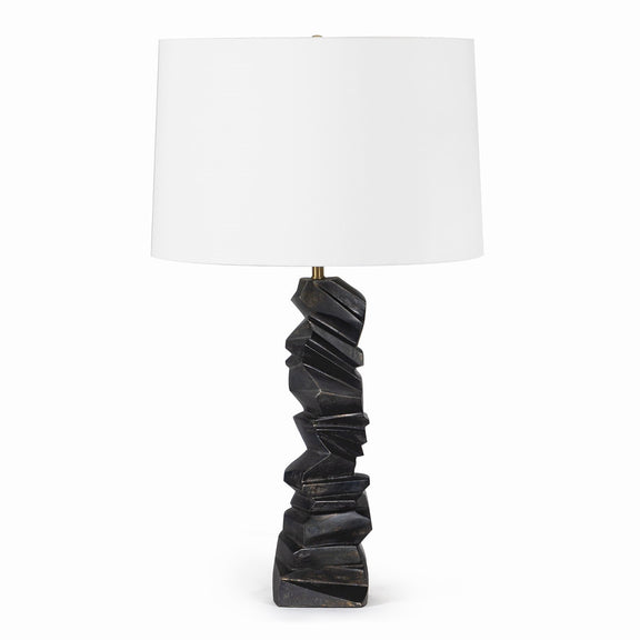 The Gallerie Table Lamp is reminiscent of stacked river-rocks, adding a natural element to this sculpturally-inspired piece. Its patinated, bronze-like finish is topped with a white linen shade and complimented by natural brass fittings, perfect for nature and art lovers alike. The Gallerie would look stunning in a living room, home office or entryway.