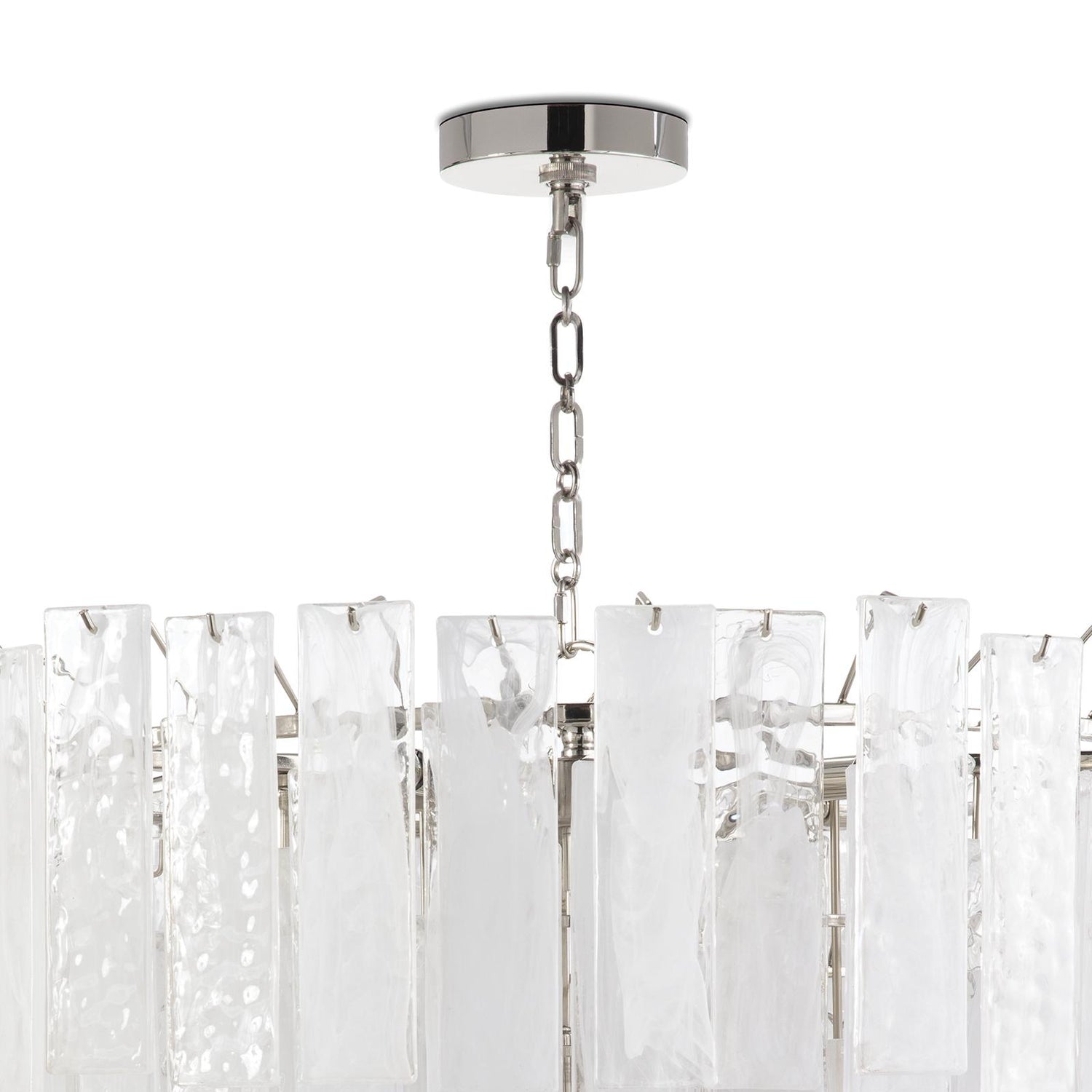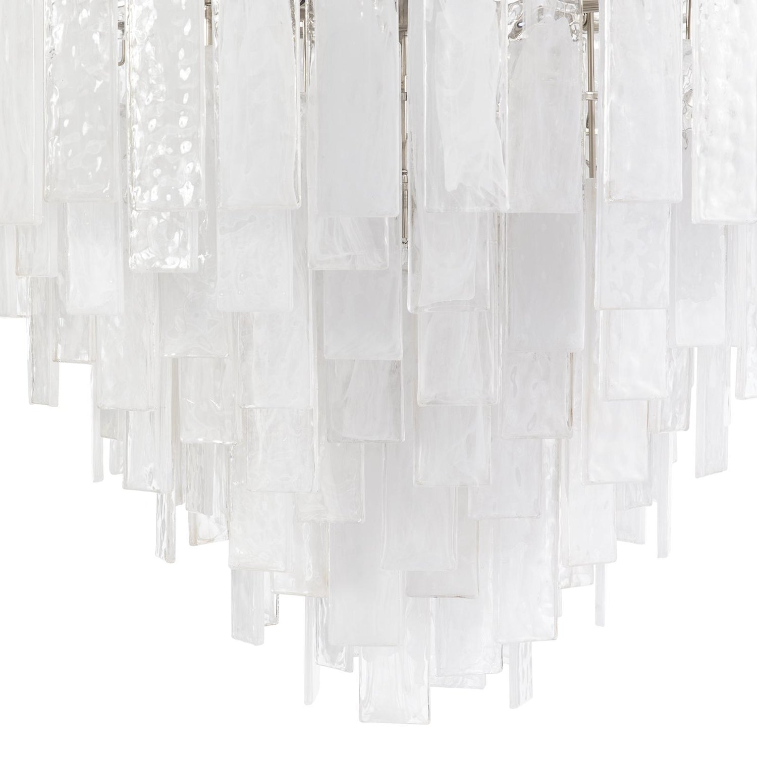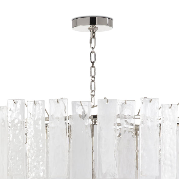 Panes of striking water glass with white swirls adorn the large Glacier chandelier to create a dynamic piece full of movement. The glass diffuses the light, providing a soft glow to the area around it, perfect for a foyer or living room.