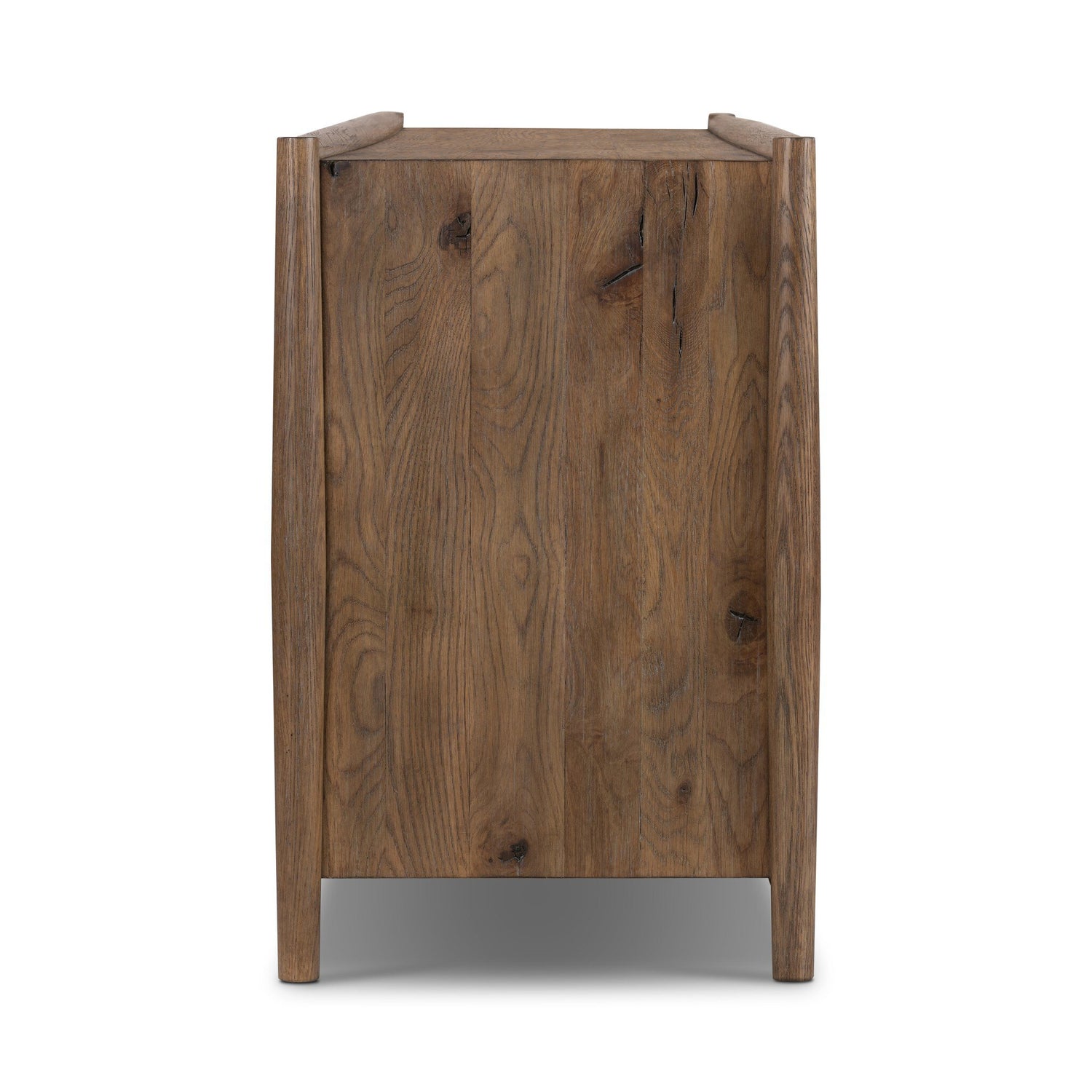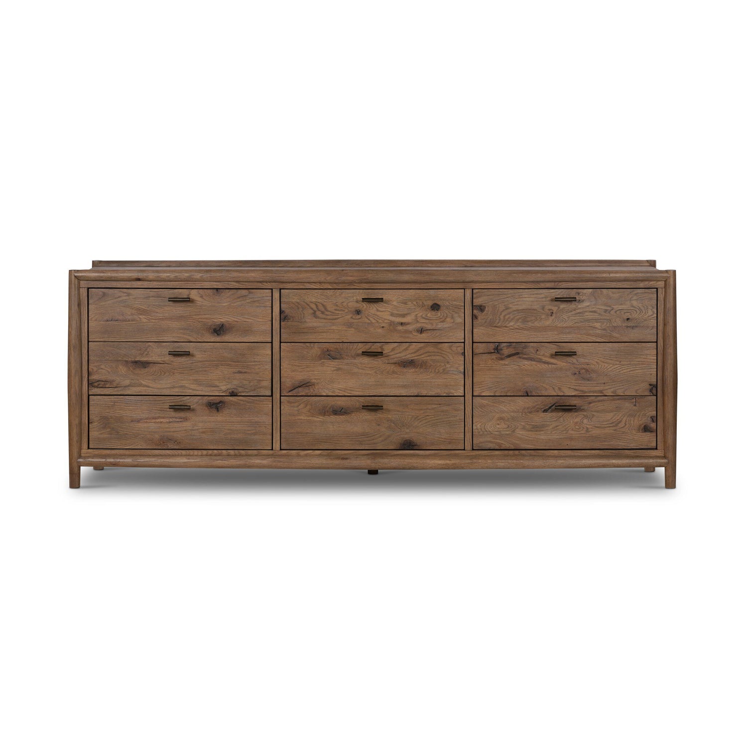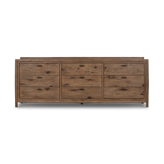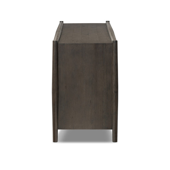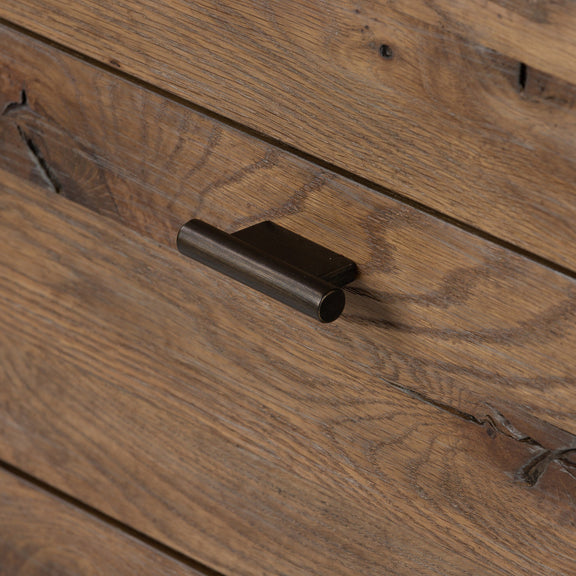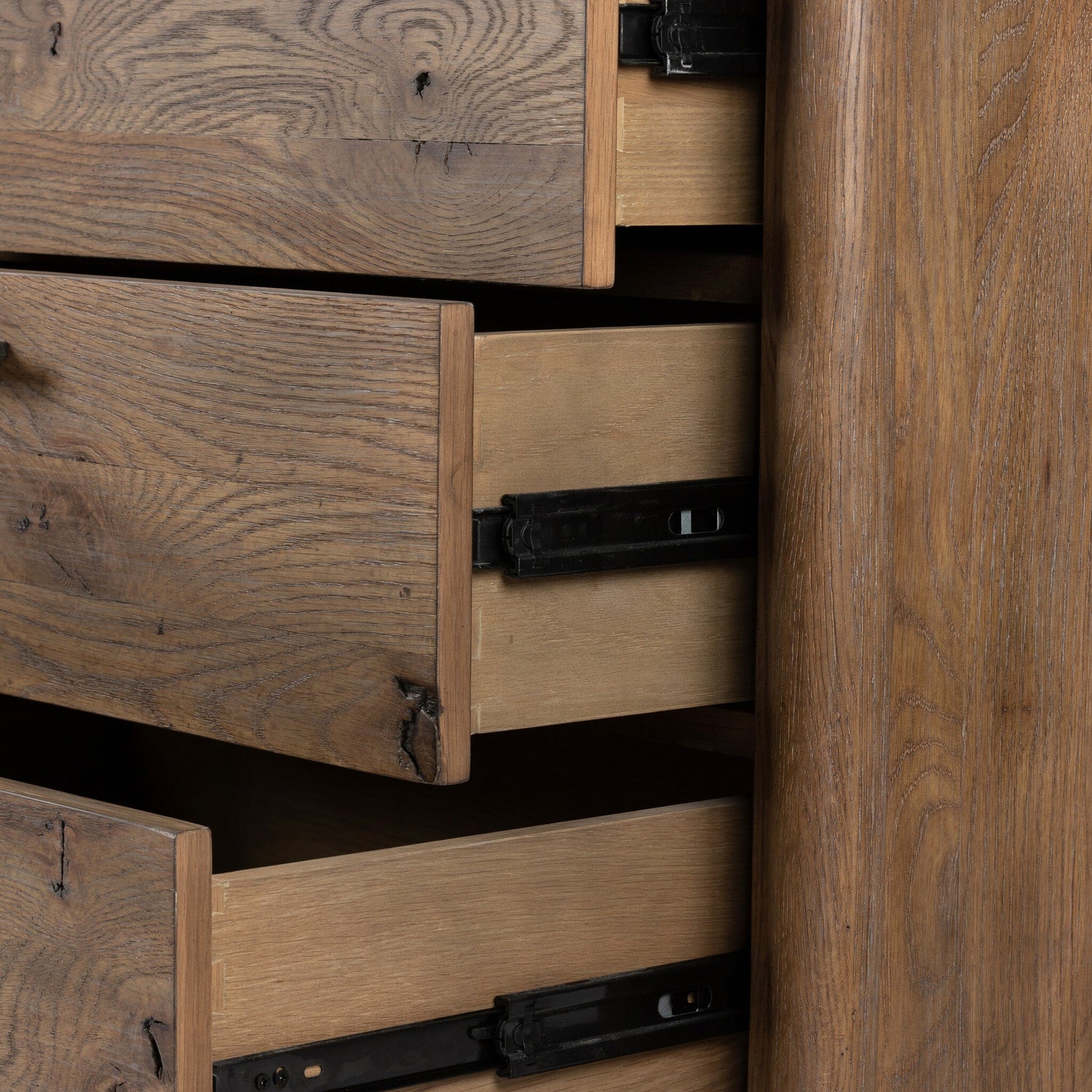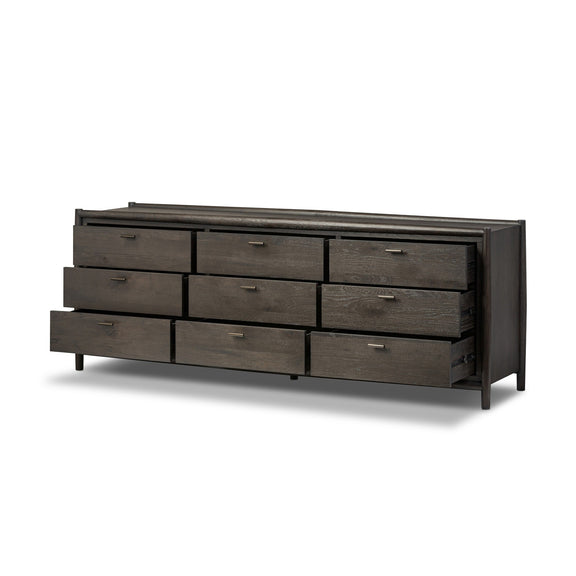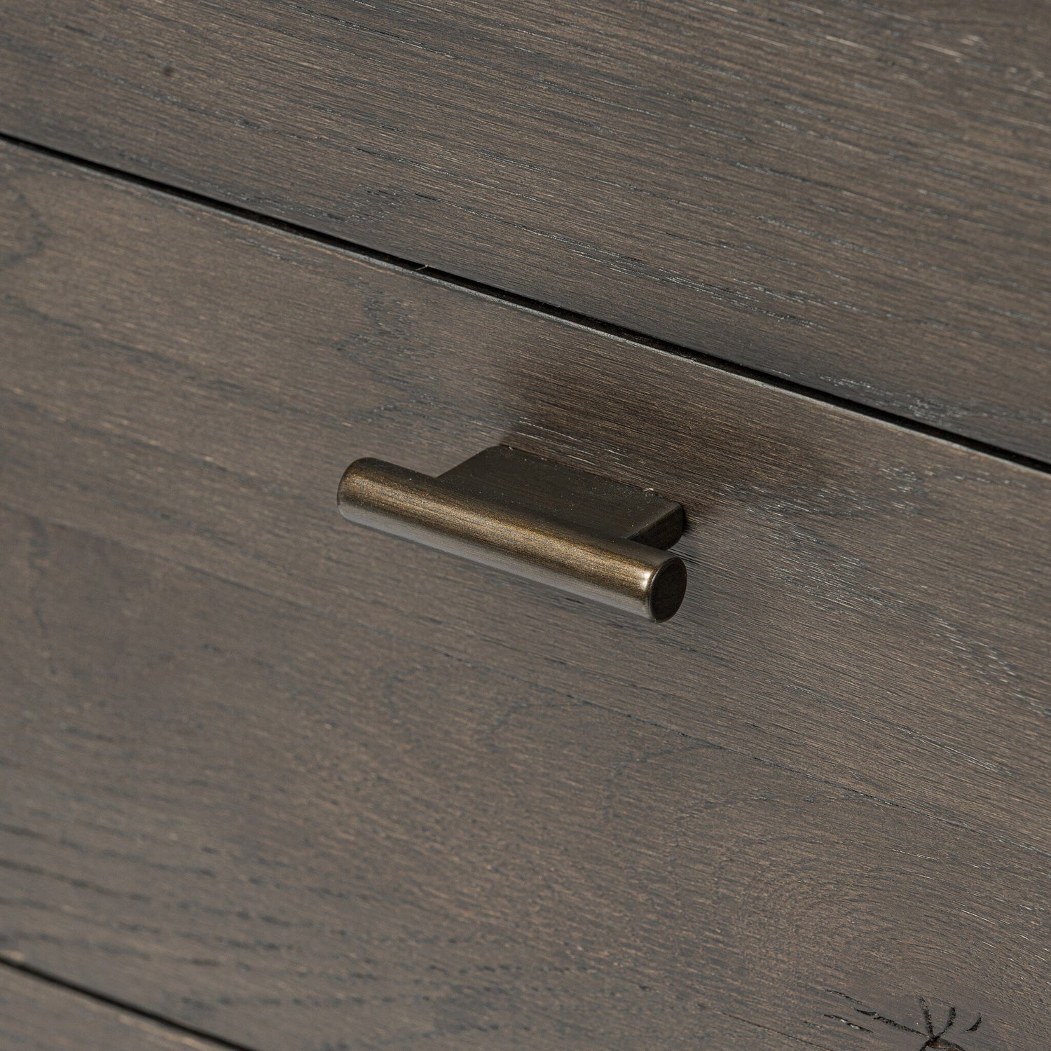 The traditional spindle structure brought to modern speed. Made from smoked black oak, nine drawers bring generous storage space to the bedroom. Simple cylindrical hardware is finished in an aged bronze.