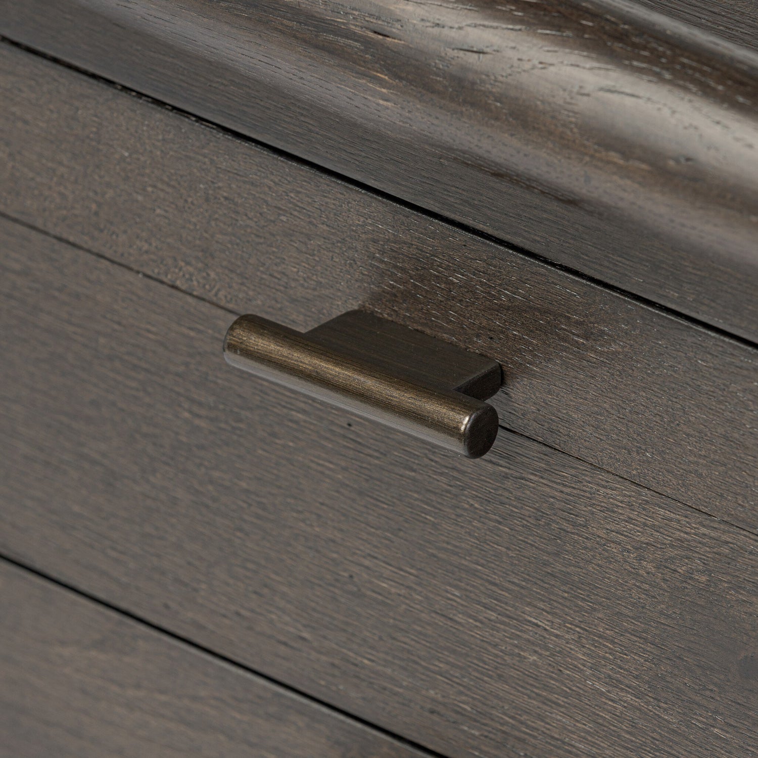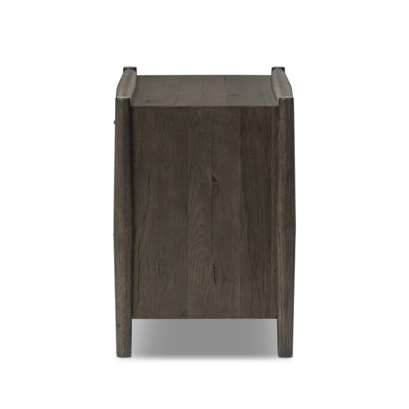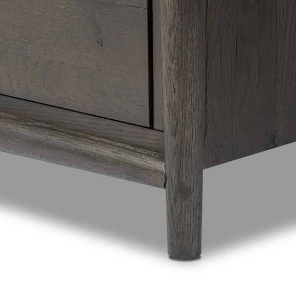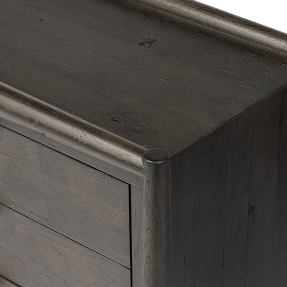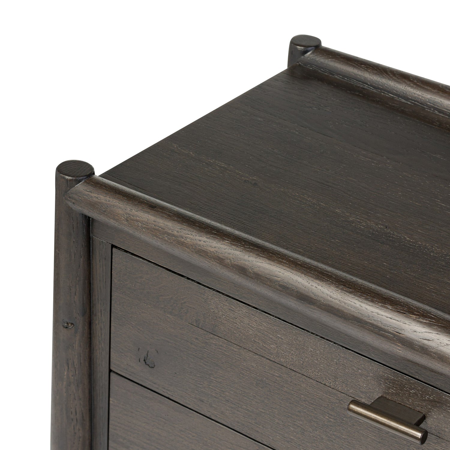 Traditional, reimagined. Made from rustic weathered oak, a three-drawer nightstand inspired by spindle design brings bonus storage to the bedside.