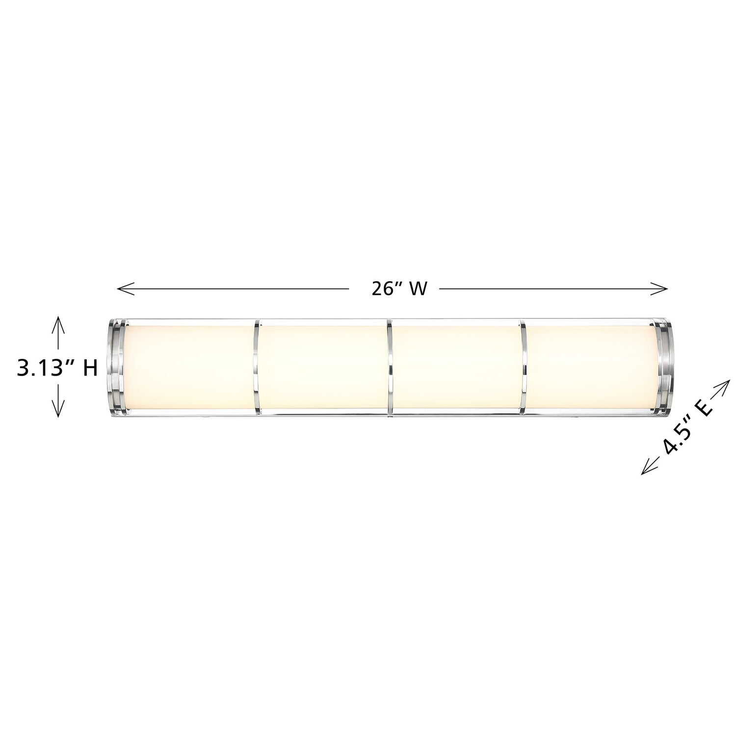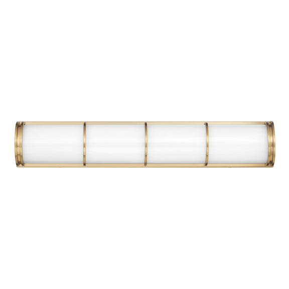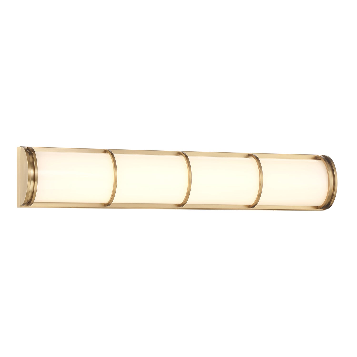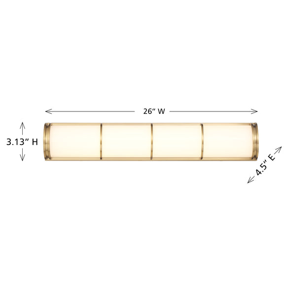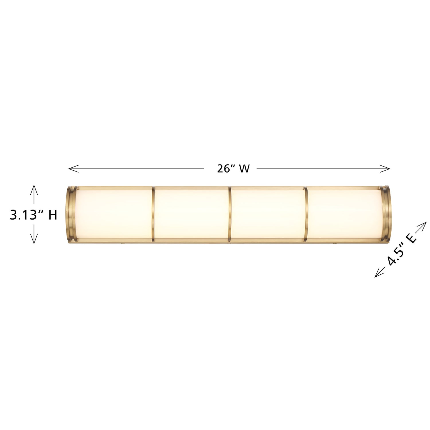 This Savoy House Harper LED wall light has a super sleek and chic look that makes it an ideal solution for bathroom vanities, hallways, foyers or any other space that needs a big dose of bright, contemporary illumination. The etched white glass shade is accentuated by slim detailing that is finished in Warm Brass, creating a perfect pairing. Harper is 4.64" in height, 26" in width and extends 4.5" from the wall. It is illuminated by integrated LED light, giving off 2550 lumens at a CRI of 90 and a color temperature of 3000K.