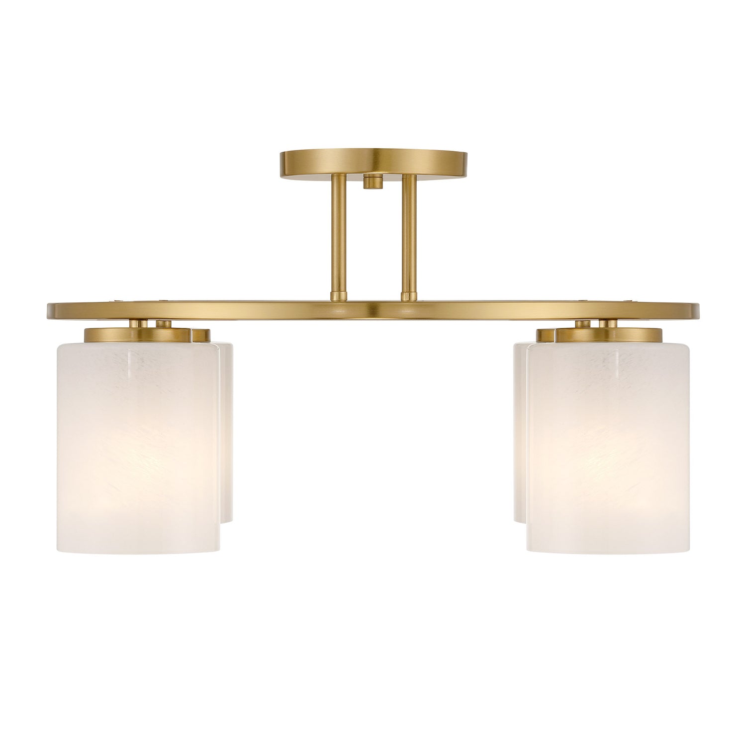 Illuminate any room with the bold modern style of the Savoy House Herron 4-light ceiling semi-flush mount. Its sleek, round structure wears a Warm Brass finish and is decorated with cylinders of swirling, stunning strie glass. Herron is 12" in height and 24" in width. It uses four standard size bulbs of up to 60 watts per bulb. Bulbs not included.