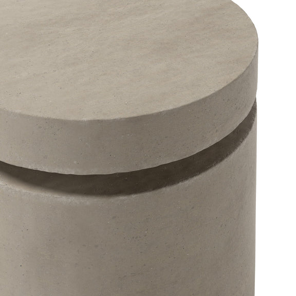 This outdoor propane tank enclosure pairs with fire tables for a clean, seamless look. Made from glass-reinforced concrete, each piece is naturally finished with subtle tones of grey and cream. It can act as an end table with its lid on, and has cutouts at the base for hose attachments. Cover or store indoors during inclement weather and when not in use.