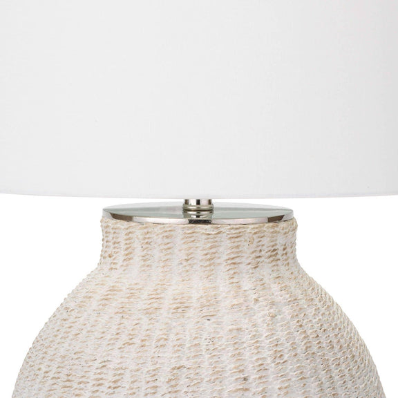 A white-washed natural woven pattern highlights this lamp's unique body shape. The Hobi's perfect mix of organic charm and polished nickel detailing creates a casual elegance perfect for a coastal retreat.