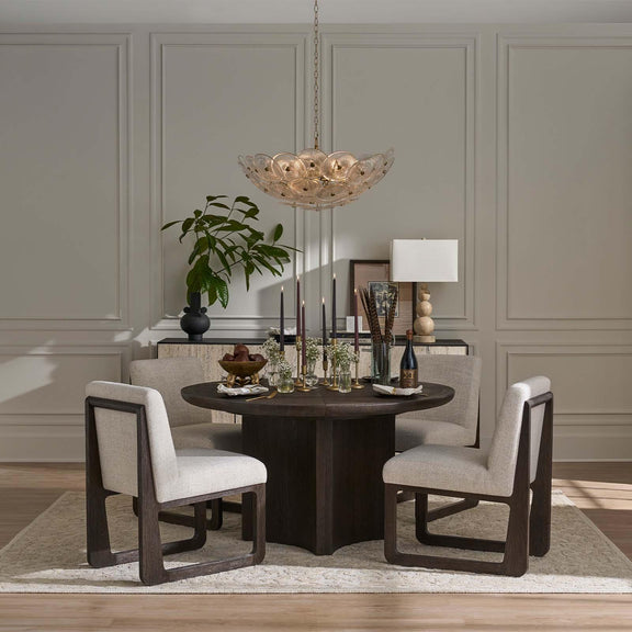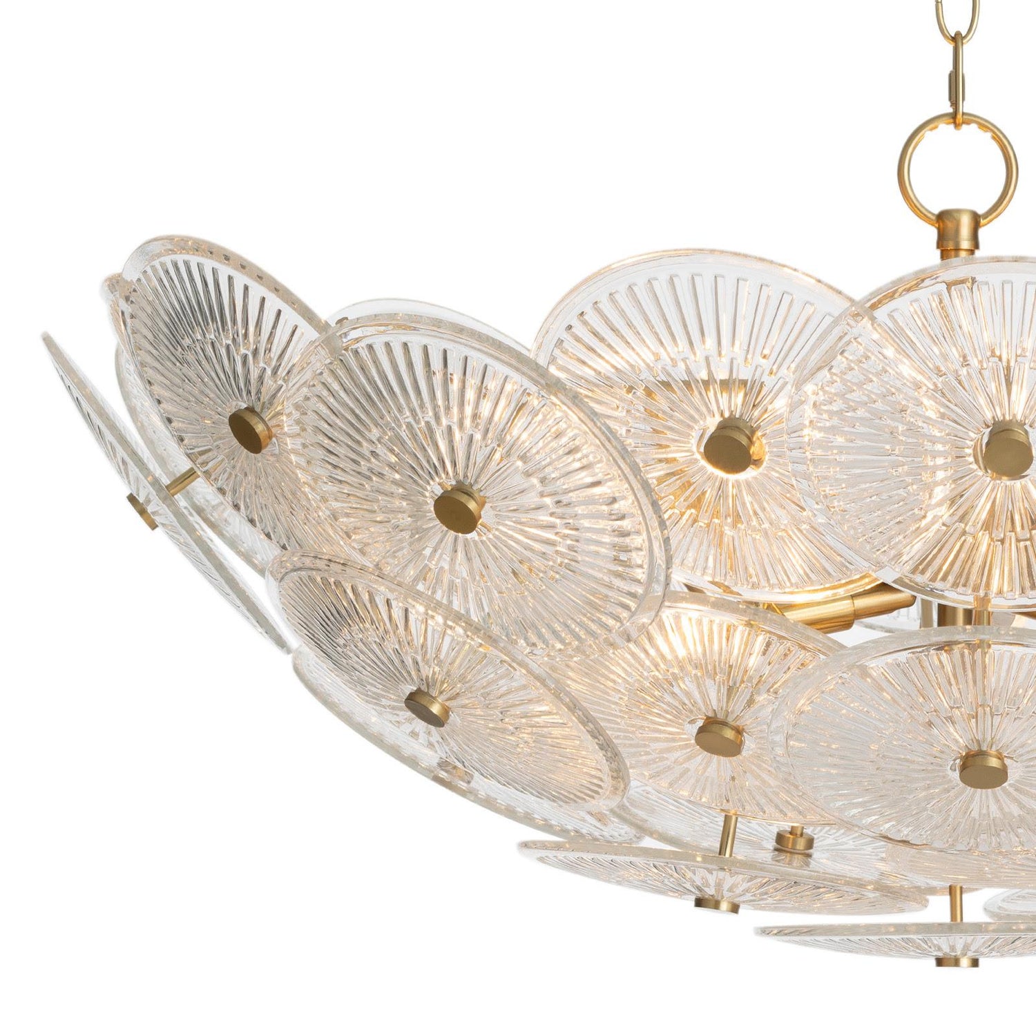 The Holly chandelier is captivating, featuring overlapping glass discs with intricate linear details reminiscent of vintage ceiling medallions while suspended on a natural brass chain. The medallions feature dotted natural brass finials for a modern, opulent touch.
