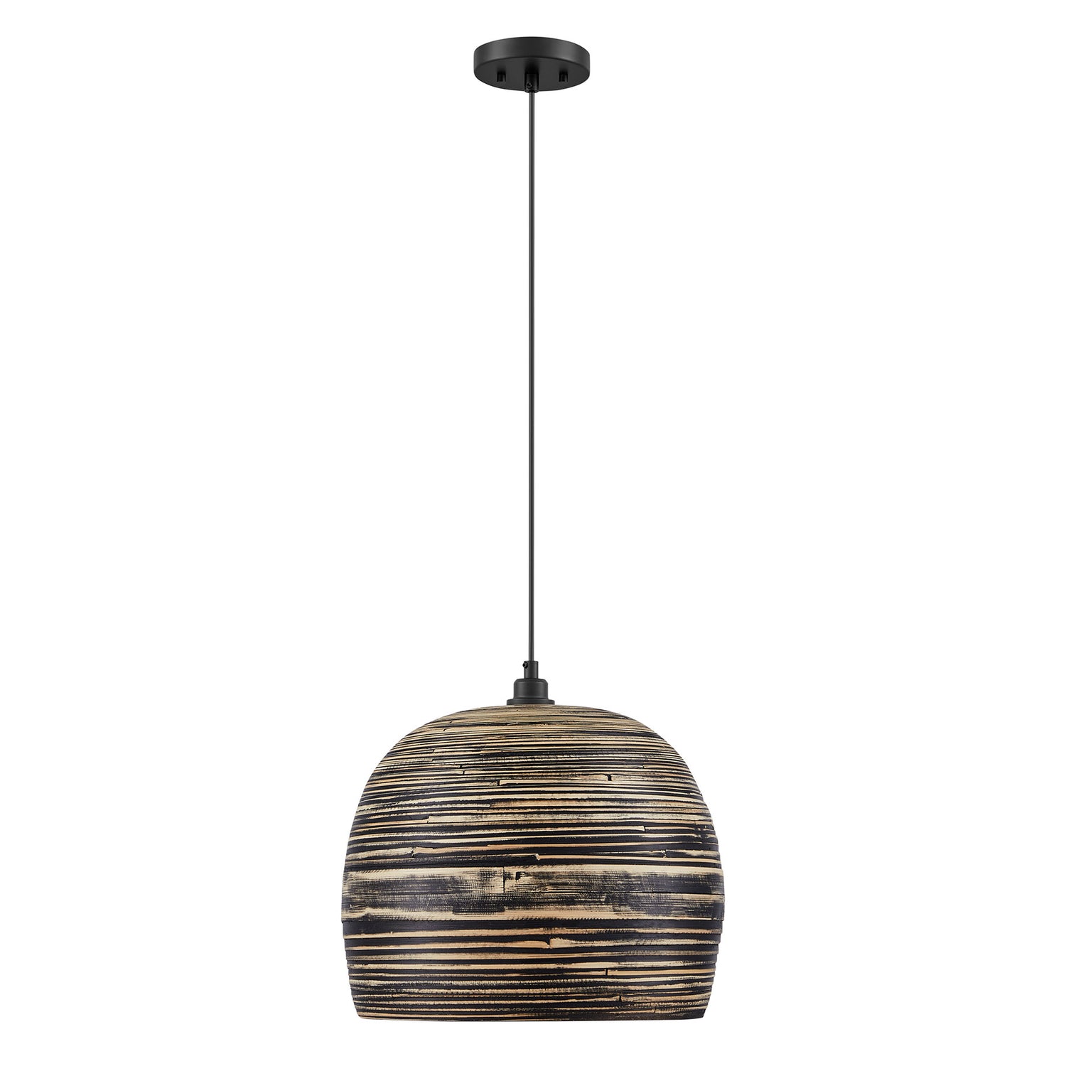 The Savoy House Jamsen 1-light pendant lets you illuminate your home with natural beauty. Its shade is crafted from spun bamboo and is adorned with a lively pattern of black stripes, creating energetic intrigue. Whether used solo or in groupings, Jamsen is sure to stand in the spotlight! It is 15" in height and 15.75" in width. Uses one standard size bulb of up to 60 watts. Bulb not included. This fixture is supplied with 120" of hanging cord.
