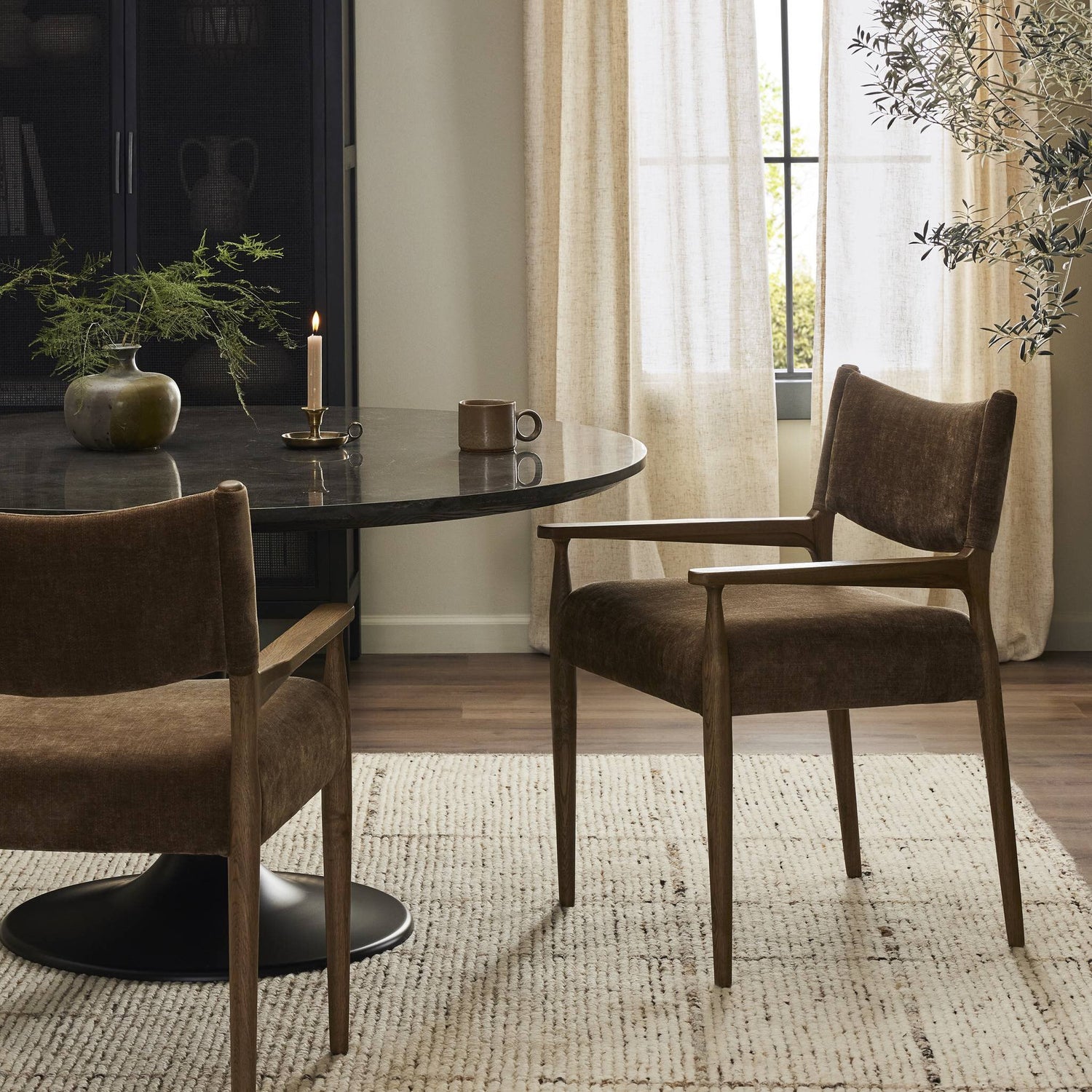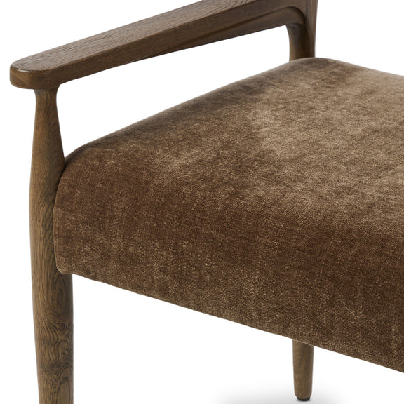 A midcentury-inspired piece brought to modern speed. A supportive, sling-style back and seat cushion are upholstered in a soft, velvety fabric, with toasted oak arms prime for the head of the table.