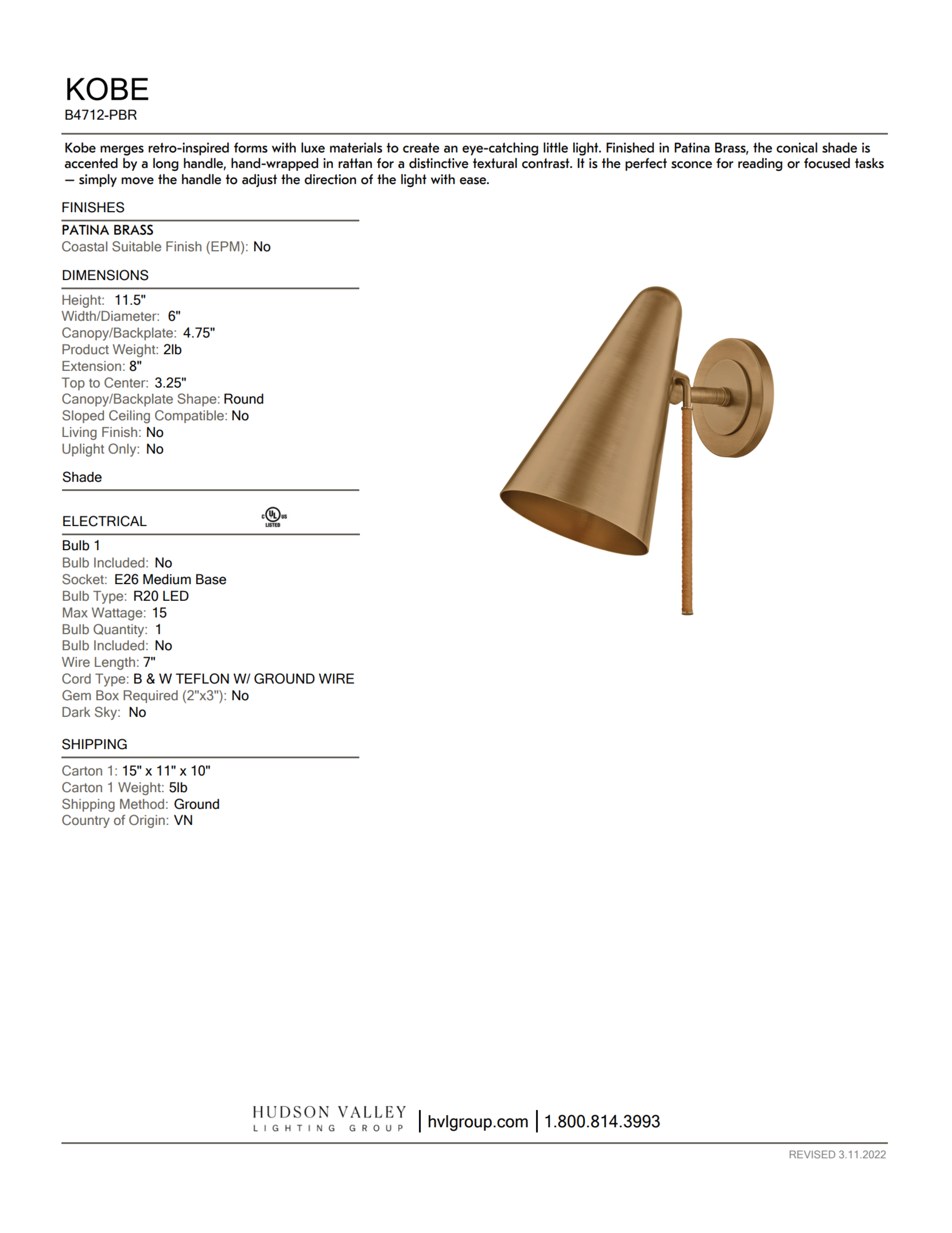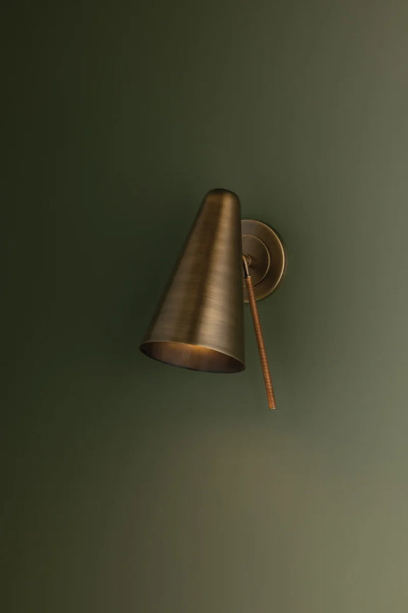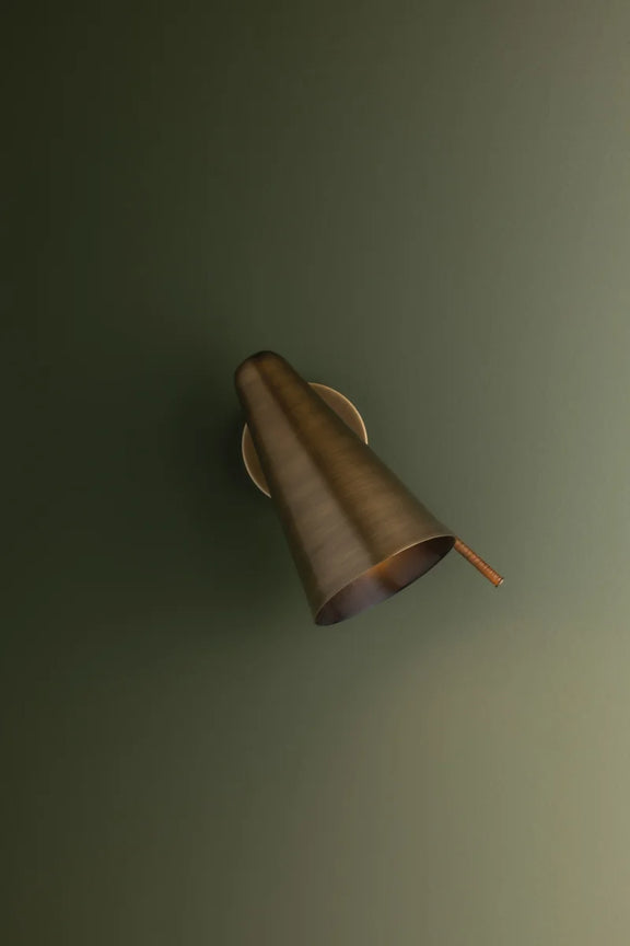 Kobe merges retro-inspired forms with luxe materials to create an eye-catching little light. Finished in Patina Brass, the conical shade is accented by a long handle, hand-wrapped in rattan for a distinctive textural contrast. It is the perfect sconce for reading or focused tasks – simply move the handle to adjust the direction of the light with ease.