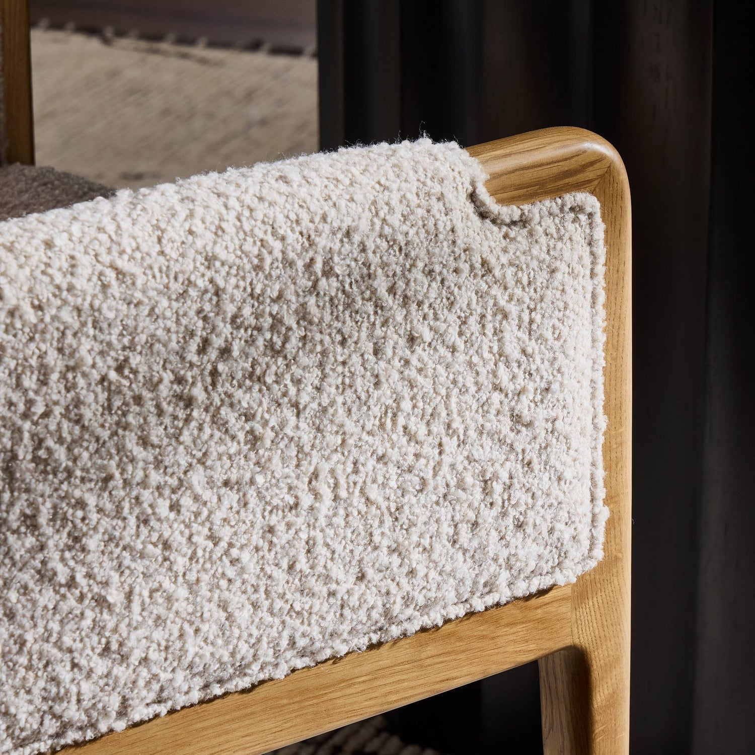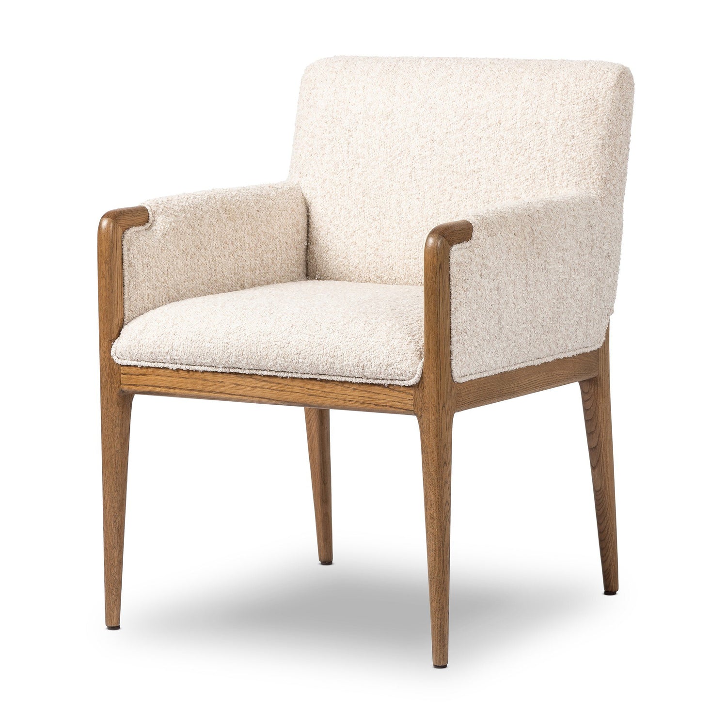 A patterned dining chair that’s all about comfort. Checkered-print upholstery is framed by light, warm oak, while a boxy profile and higher arms feel prime for the head of the table.