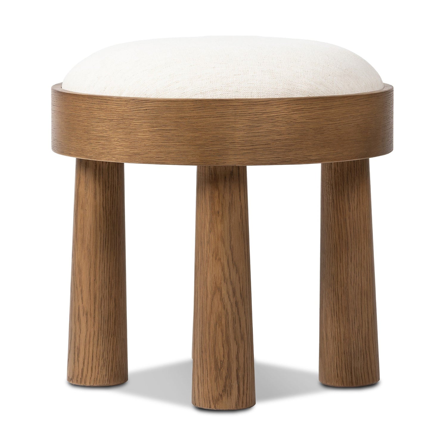 A simple, charming stool with natural oak wood veneer finish and textured neutral fabric seat. Tapered legs add subtle character.