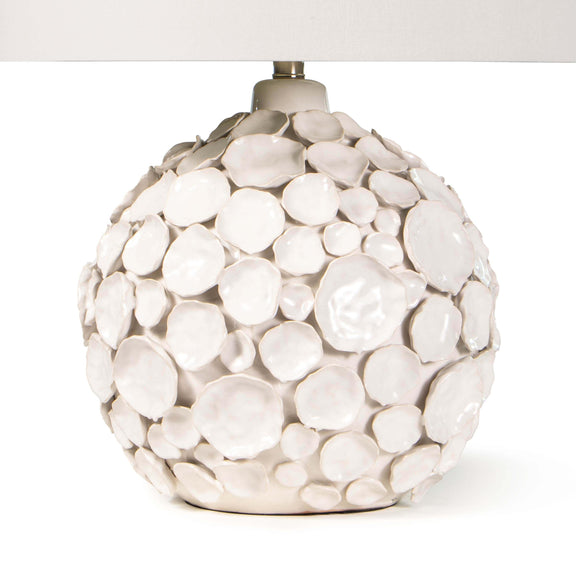 Organically shaped, the Lucia lamp is reminiscent of the beach. Multiple hand-crafted, pinched disks reveal the artist's touch in each lamp. The Lucia lamp provides a modern coastal touch to a bedroom or living room.