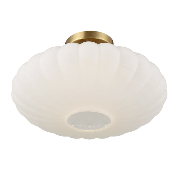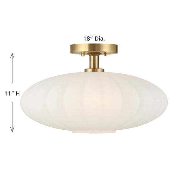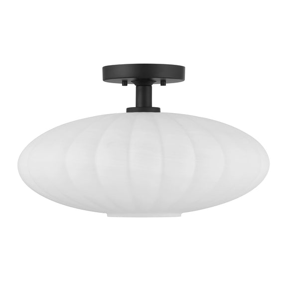 This 1-light ceiling semi-flush mount is an excellent way to boost the illumination in any room. Its ribbed white strie glass shade has a look inspired by the beauty of paper lanterns. The strie glass features dazzling swirls that draw the eye, soften the glow and work beautifully with the Matte Black finish. This ceiling light is 11" in height and 18" in width. Uses 1 standard size bulb of up to 60 watts. Bulb not included.