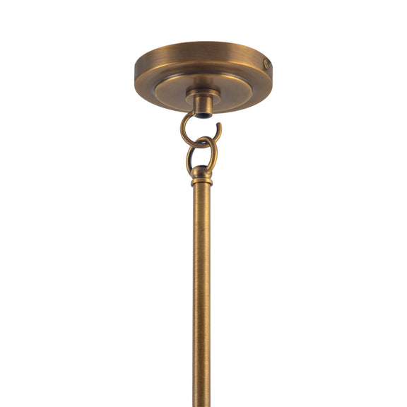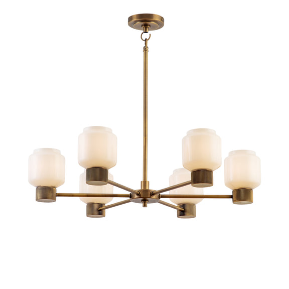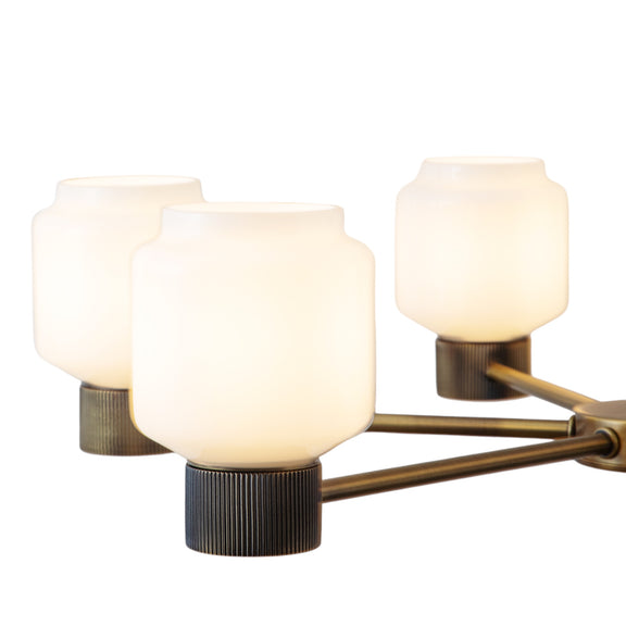 The Mabel Chandelier is inspired by vintage European lighting fixtures, with the opal glass shades complemented by reeded detailing in antique brass, creating a stunning blend of modern aesthetics and timeless elegance.