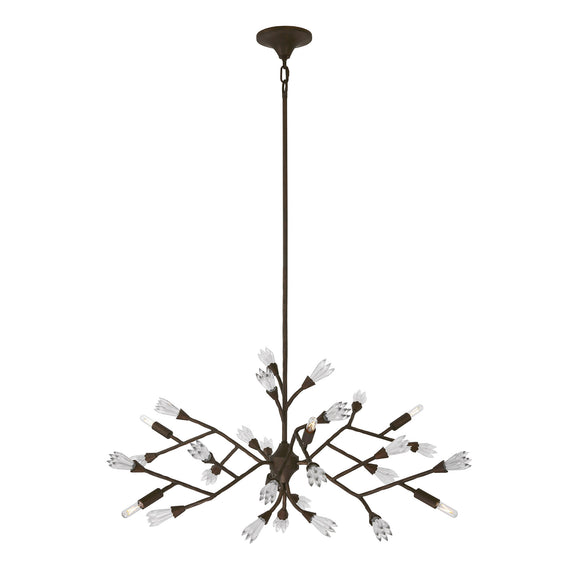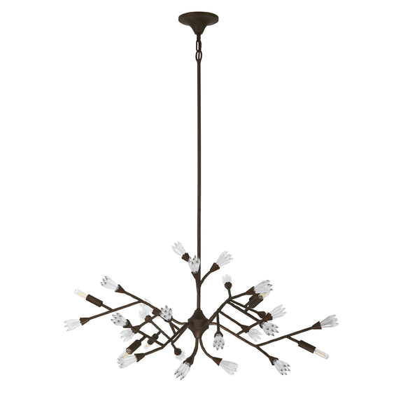 The organic meets the glamorous in the Savoy House Malinda 6-light chandelier, which was designed by award-winning interior designer and TV host Breegan Jane. Boldly textured metal branches hold faceted crystal spears that blossom forth like edgy flowers. It is all finished by hand in Bark, a dark bronze finish that imparts texture and intrigue. Malinda is 41" in width and has an adjustable height ranging from 19" to 73". It uses six candelabra size bulbs of up to 60 watts per bulb. Bulbs not included. Comes with four 12" downrods and one 6" downrod.