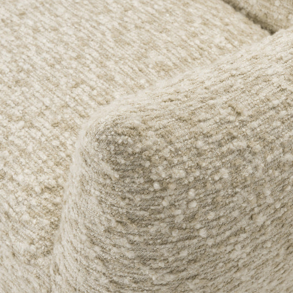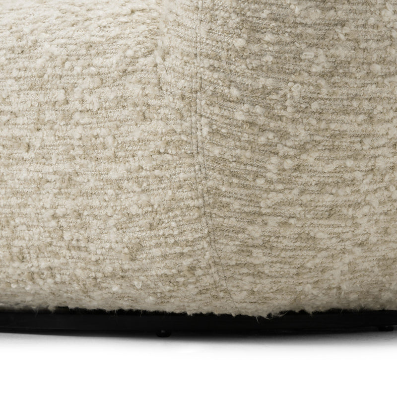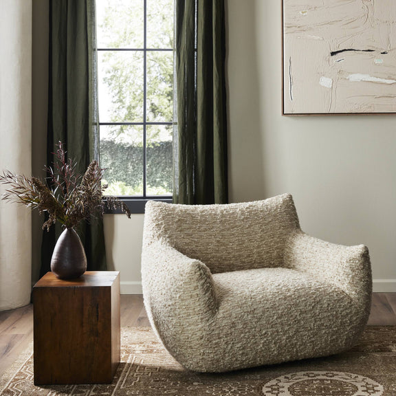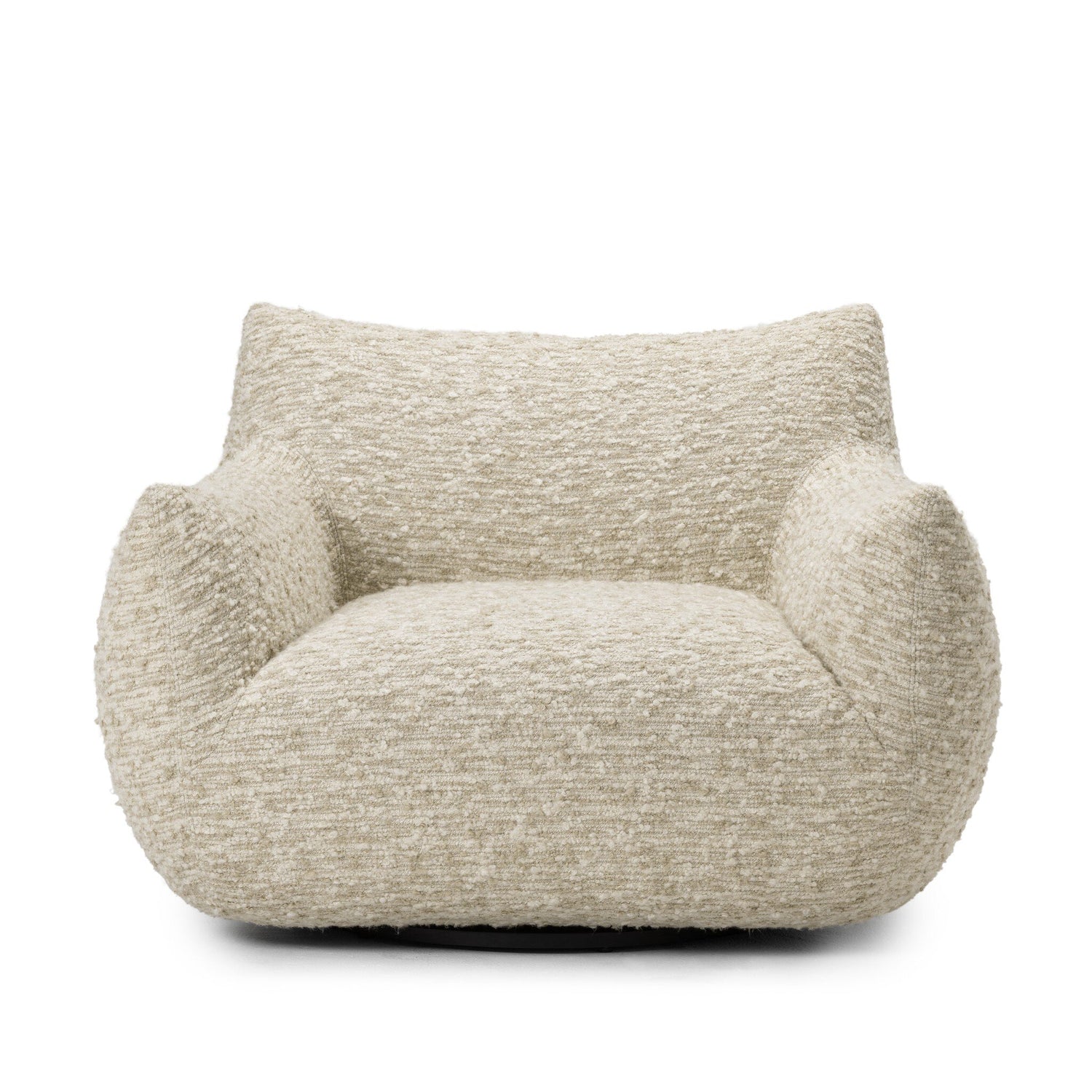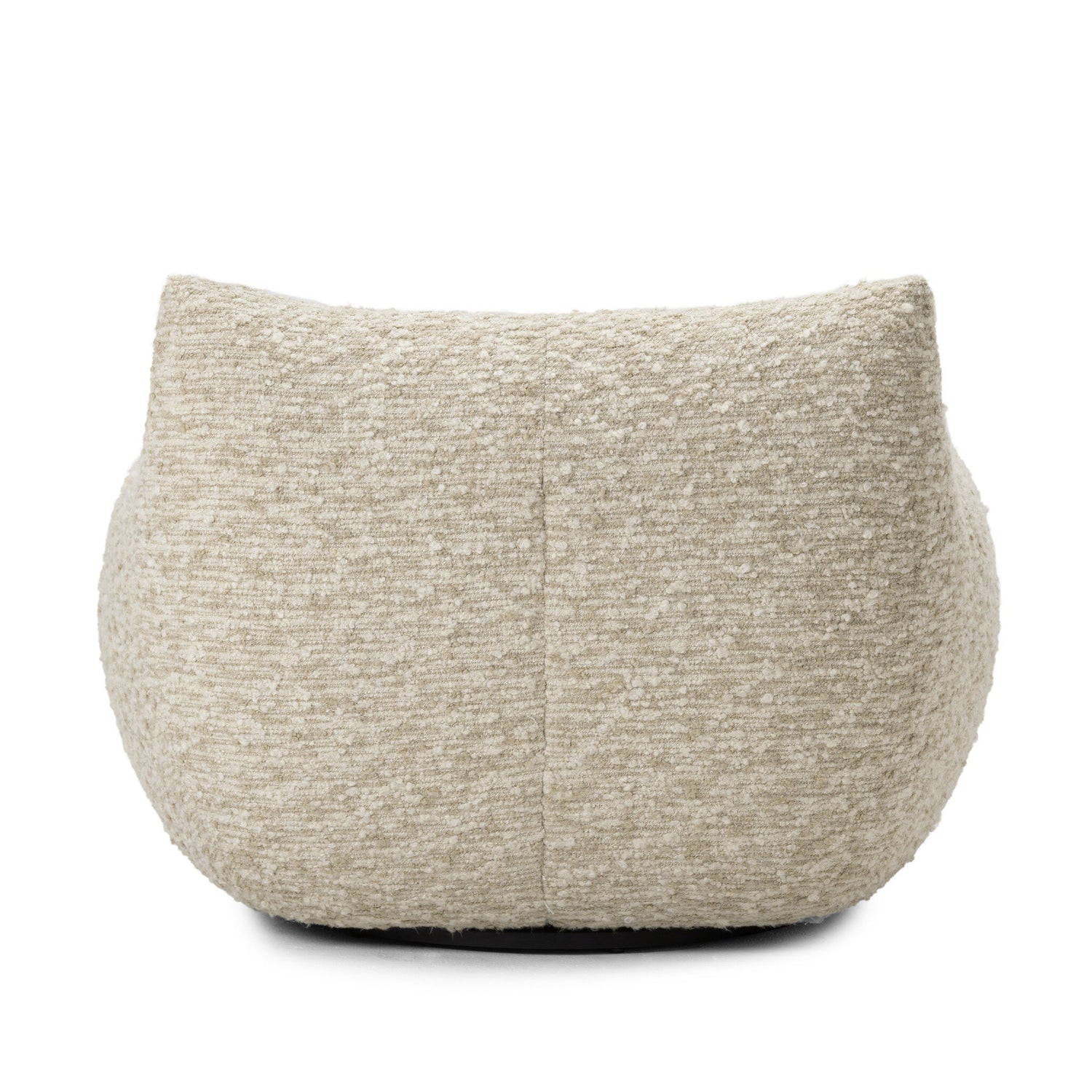 A modern take on a Seventies-inspired shape. This sink-in, pillow-like chair features S-spring suspension for extra comfort and durability in the seat, all on a 360-degree swivel. Upholstered in an exaggerated boucle fabric with extra depth and texture throughout.