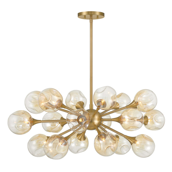 Heighten the drama of any room with the boldly beautiful Savoy House Matisse 18-light pendant. Its Sputnik style structure is studded with eye-catching dimpled shades of gold asymmetric plated glass and finished in Warm Brass to create a spectacular look. Matisse is 38" in length, 20.5" in width and has an adjustable height ranging from 14.75" to 68.75". Uses eighteen G9 bulbs, which are not included. Comes with four 12" downrods and one 6" downrod.
