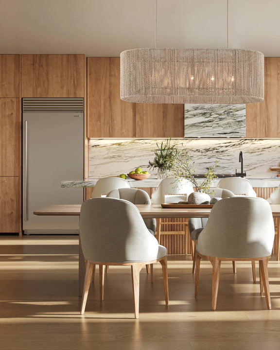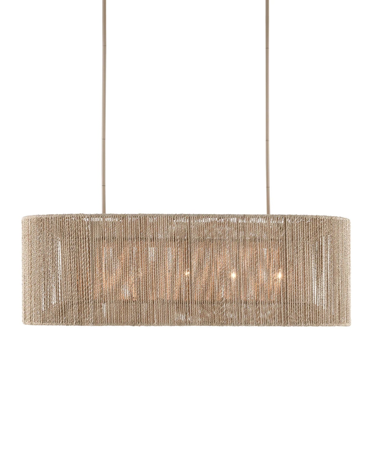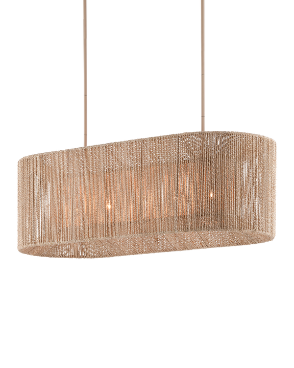 The Mereworth Oval Chandelier has an oblong wrought iron frame around which natural abaca rope has been painstakingly wrapped to create its shade. The rope chandelier emits a warm glow thanks to the color of the abaca. The material also lends the chandelier a nautical feel that makes it perfect for seaside retreats and oceanfront homes.