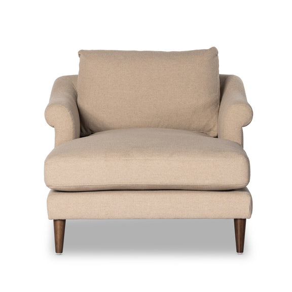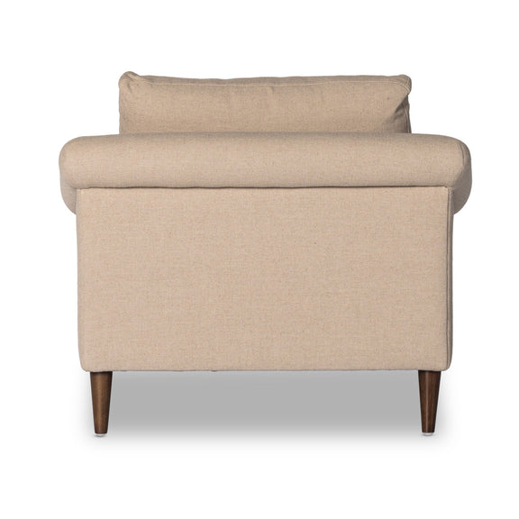 Clean lines and a classic roll arm detail craft a high chaise lounge with loose feather-blend seat and back cushions, accented by tapered legs. Casual, timeless performance linen-blend upholstery adds modern comfort. Performance fabrics are specially created to withstand spills, stains, high traffic and wear, ensuring long-term comfort and unmatched durability. Slipcover can be removed for machine washing; steaming recommended.